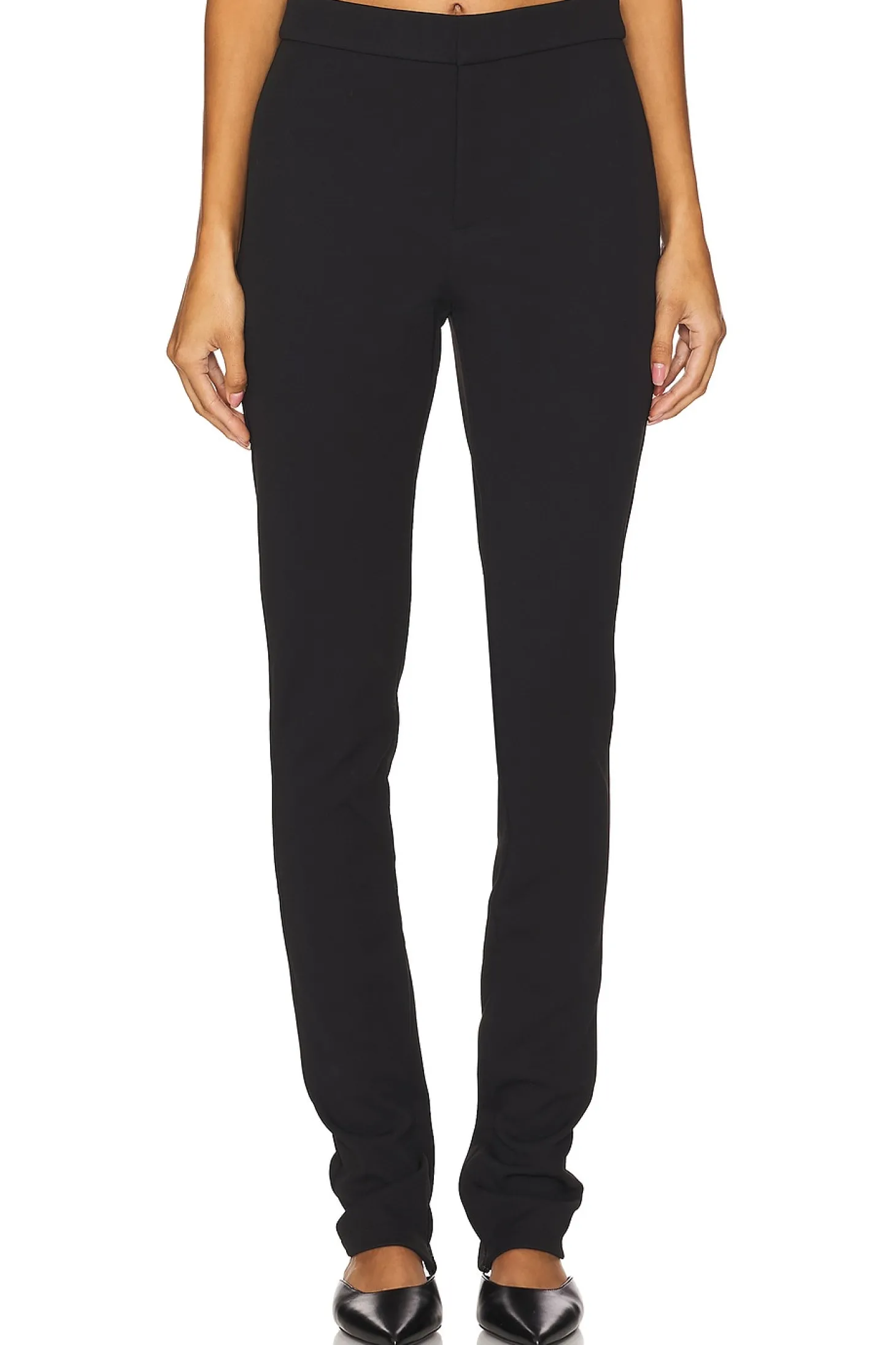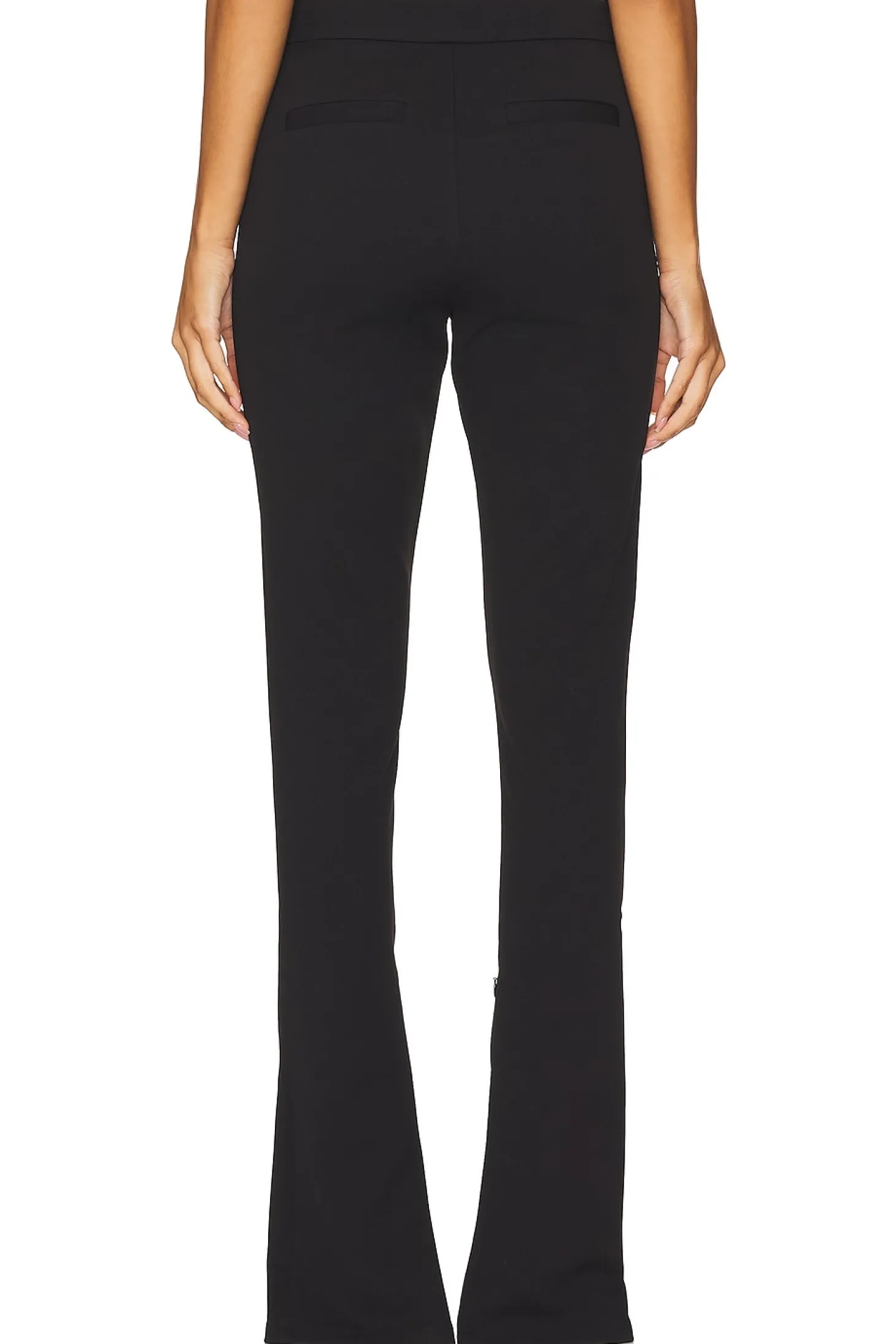 Self 1: 95% polyester 5% spandex Self 2: 100% polyester.Made in China.Dry clean only.Zip fly with hook and bar closure.Back welt pockets.Slit detail at inner ankle with zipper closure.Crepe fabric.13" at the knee and 13" at the leg opening