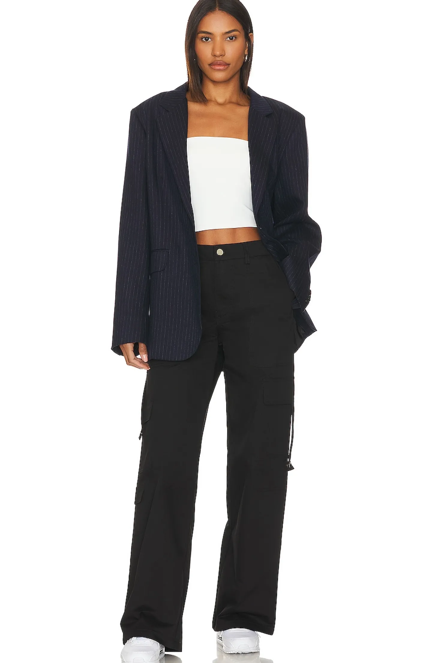 100% cotton.Made in China.Dry clean.Zip fly with button closure.7-pocket styling including side cargo pockets.22" at the knee and 22" at the leg opening