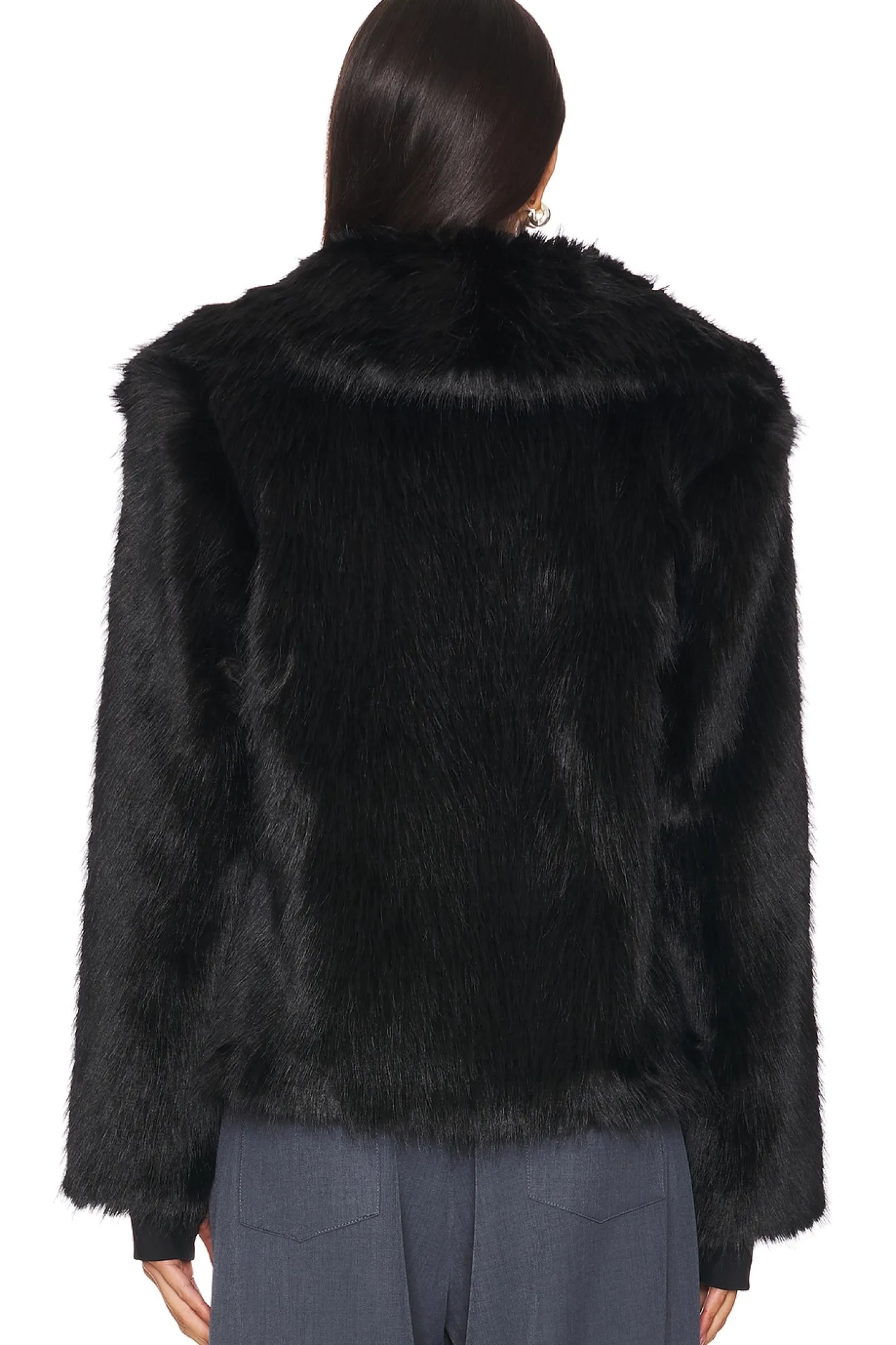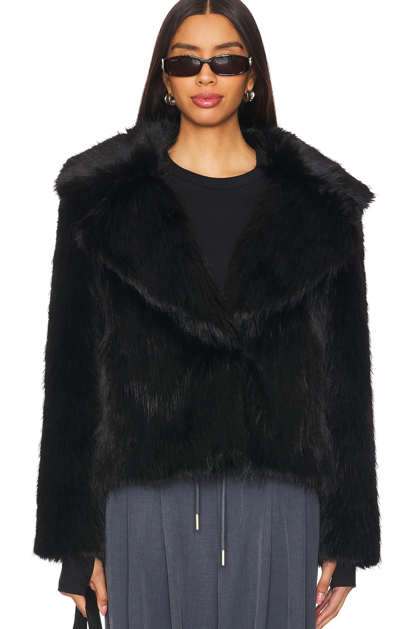 Self & Lining: 100% polyester.Made in China.Dry clean only.Front hook and eye closure.Side seam pockets sand notched lapel collar.Heavyweight faux fur fabric with thumbhole design