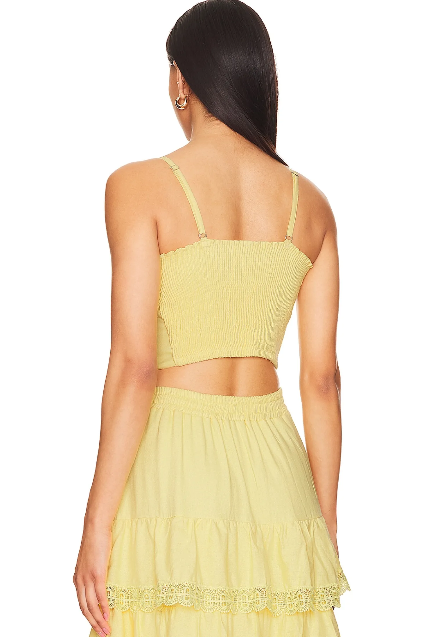 Body: 70% rayon 30% linen Lining: 100% rayon .Made in Colombia.Hand wash cold.Unpadded underwire cups.Smocked back panel with adjustable shoulder straps.Lace trim at neckline.Item not sold as a set