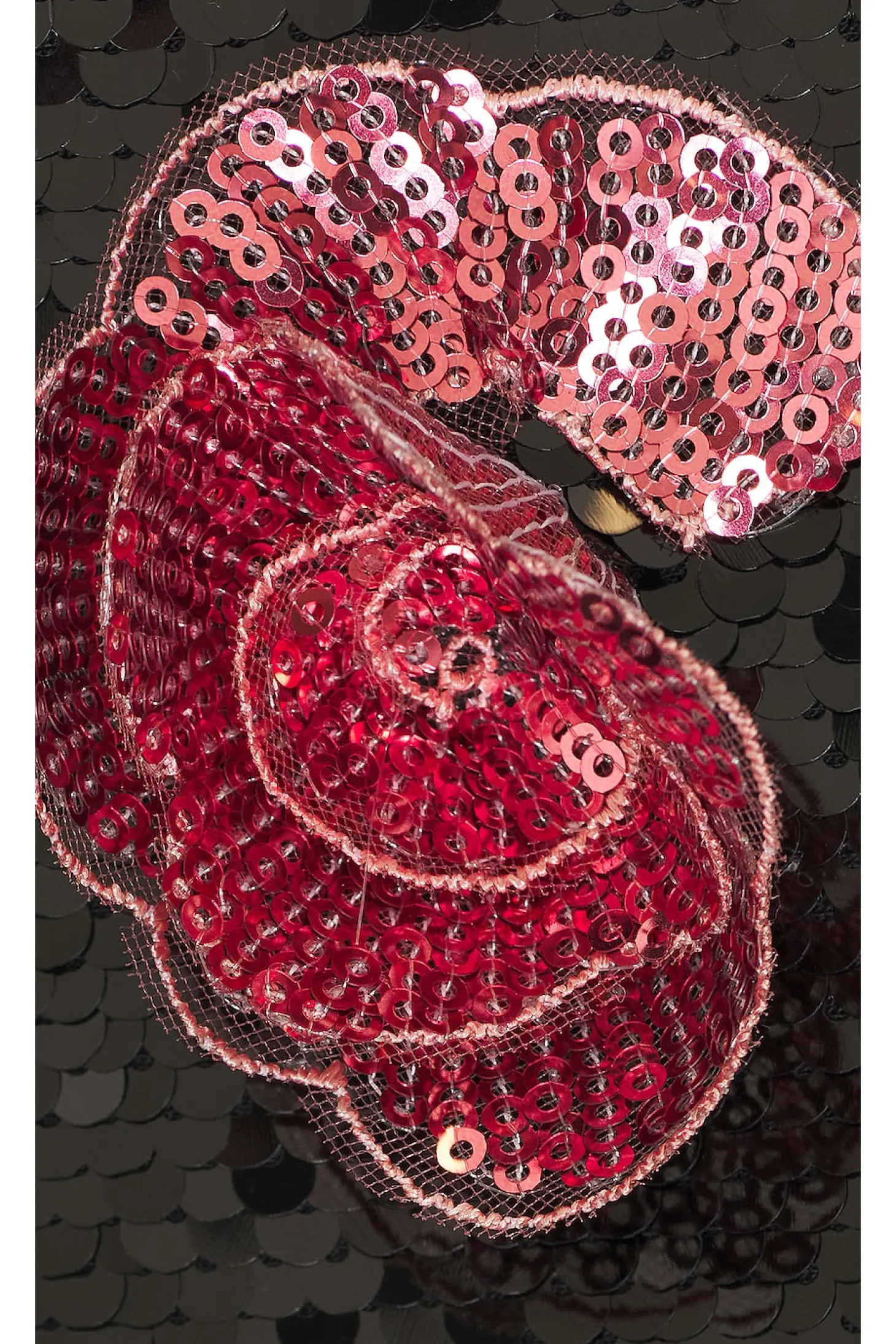 97% recycled polyester 3% spandex.Made in China.Dry clean only.Fully lined.Hidden side zipper closure.Adjustable crisscross shoulder straps.Midweight sequin embellished fabric with contrast sequined rosettes throughout