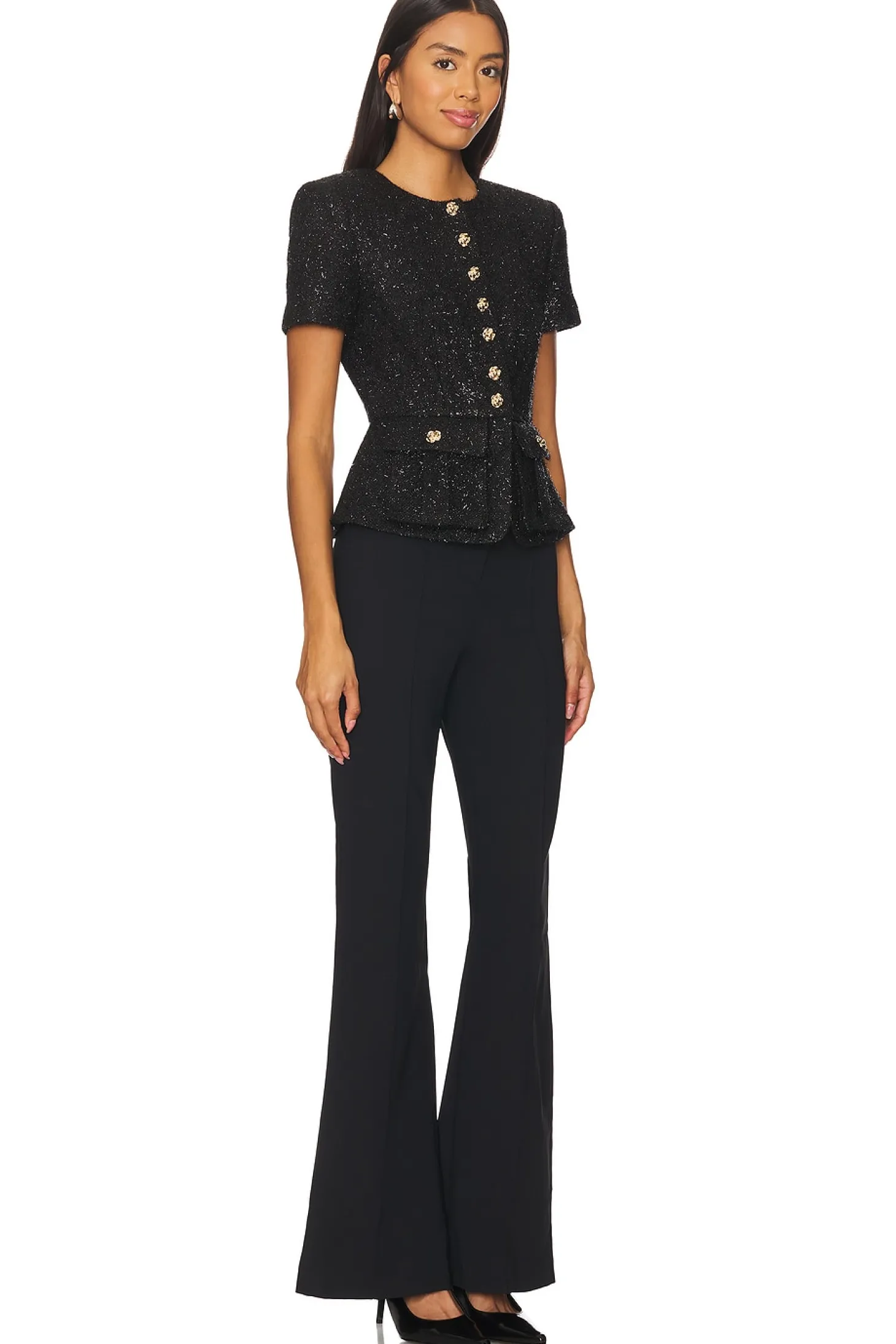 Self 1: 53% polyester 17% metallized fiber 13% viscose 9% cotton 5% polyamide 3% acrylic Self 2, Lining & Backing: 100% polyester.Made in China.Dry clean only.Zip fly with button closure.Front flap pockets with snap button closure.Tinsel-like fabric at bodice.Midweight suiting fabric at leg