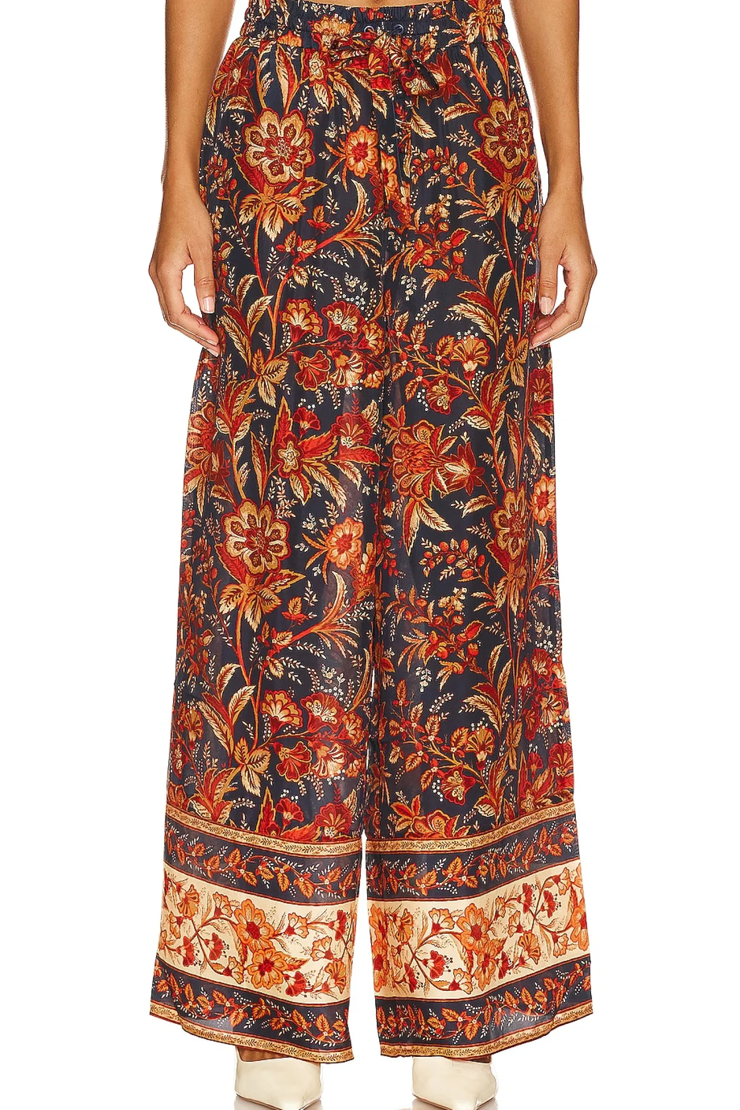 100% silk.Made in China.Dry clean only.Smocked elastic waistband with drawstring closure.Satin fabric.28" at the knee and 28" at the leg opening