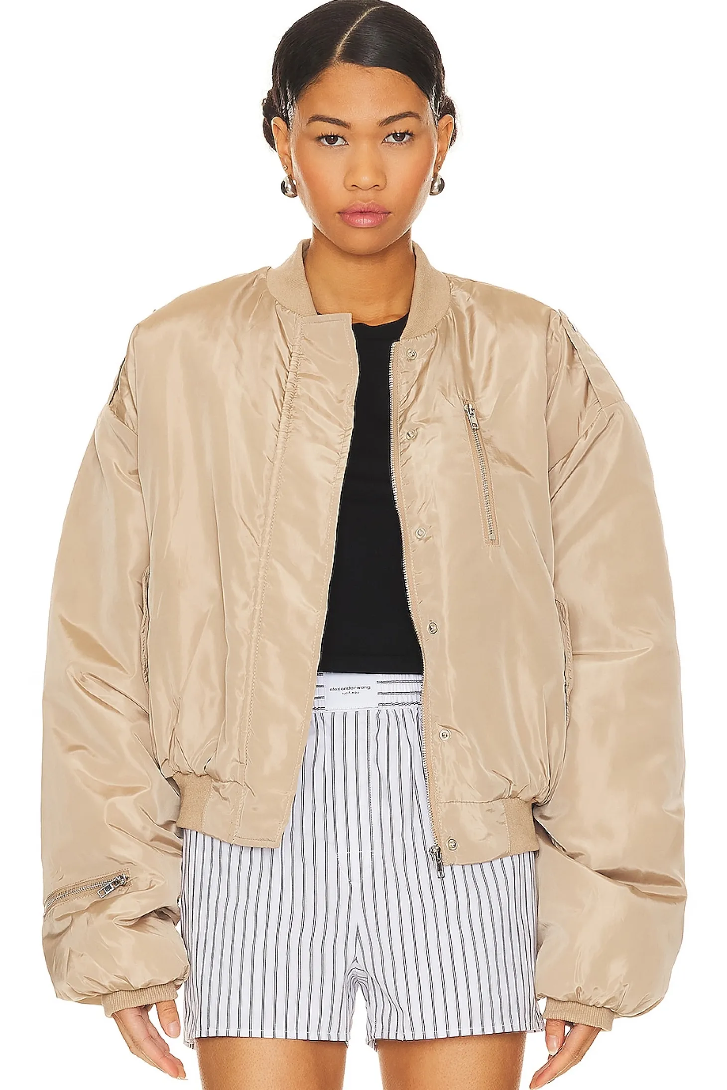 Self 1: 100% polyester Self 2: 60% cotton 35% polyester 5% elastane Self 3: 97% polyester 3% elastane.Made in China.Dry clean only.Front zipper and snap button placket.Side slant snap button pockets.Zipper accent at back and sleeves.Ripstop fabric
