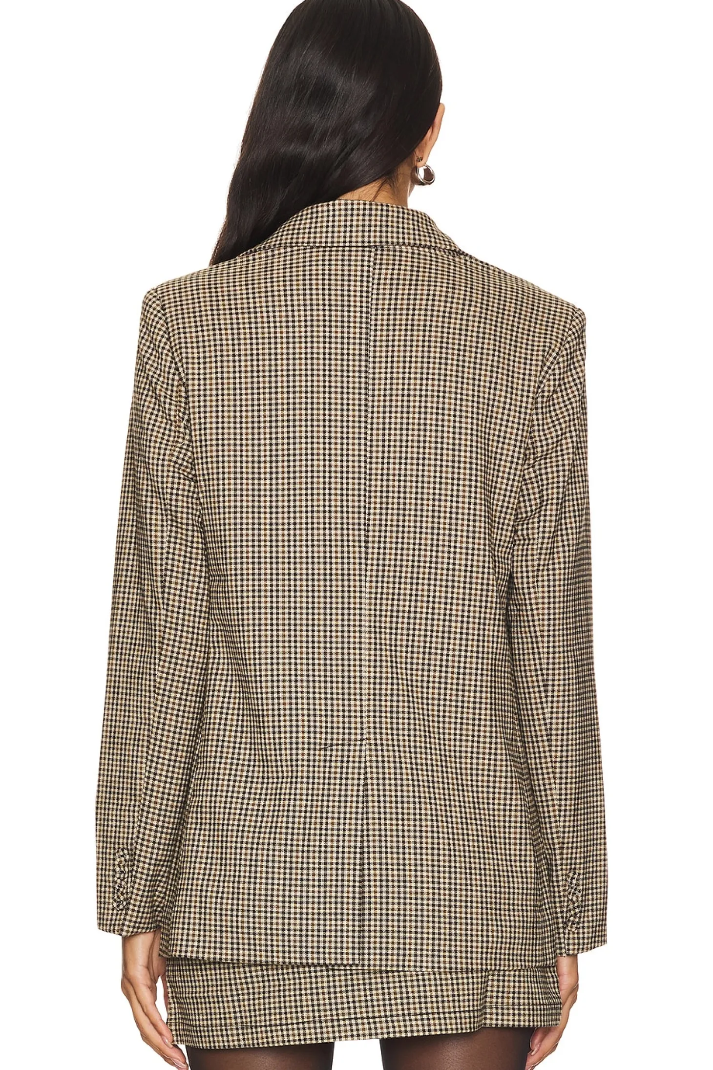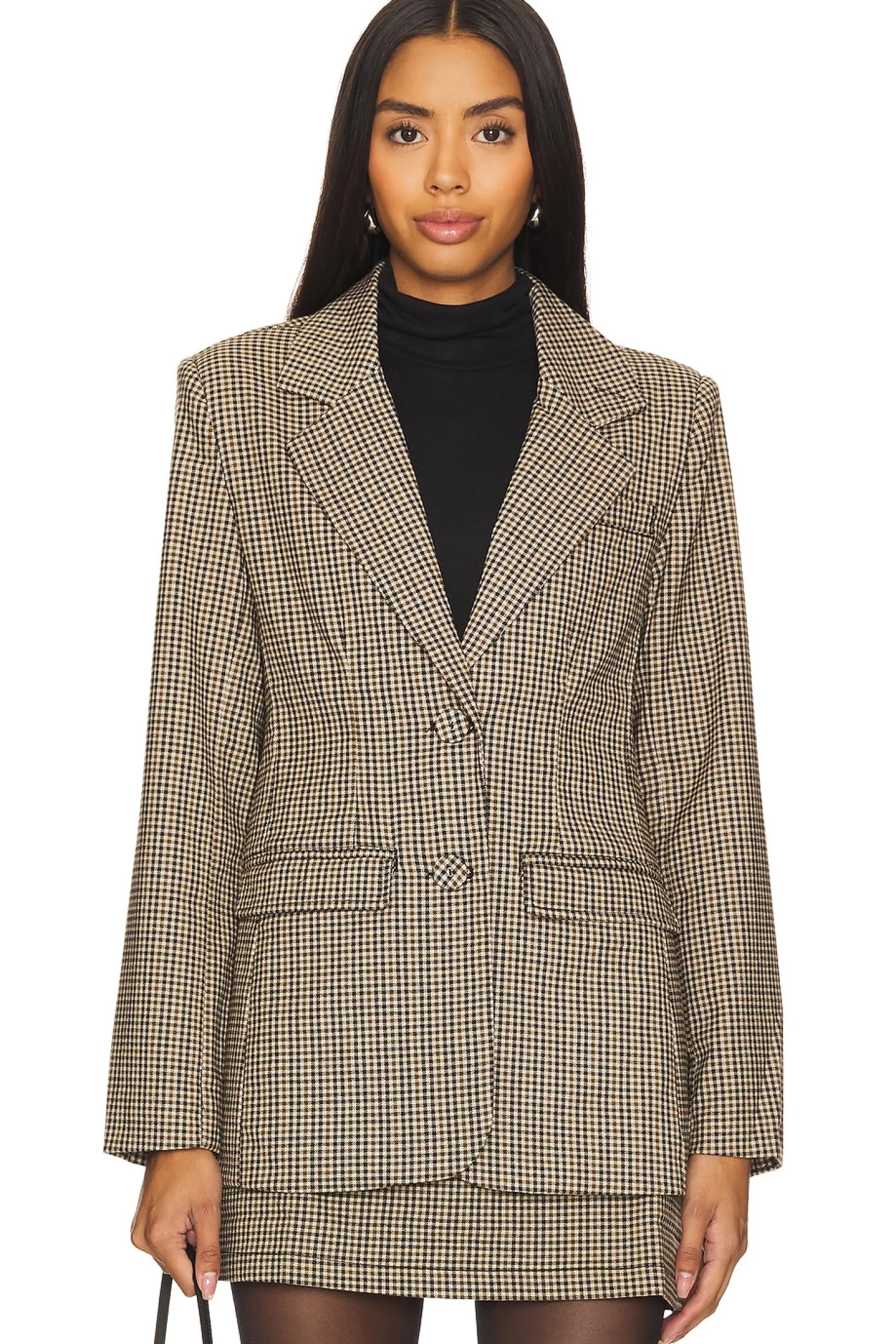 62% polyester 35% viscose 3% elastane.Made in China.Machine wash.Front button closure.Padded shoulders.Button cuffs.3-pocket styling.Twill fabric