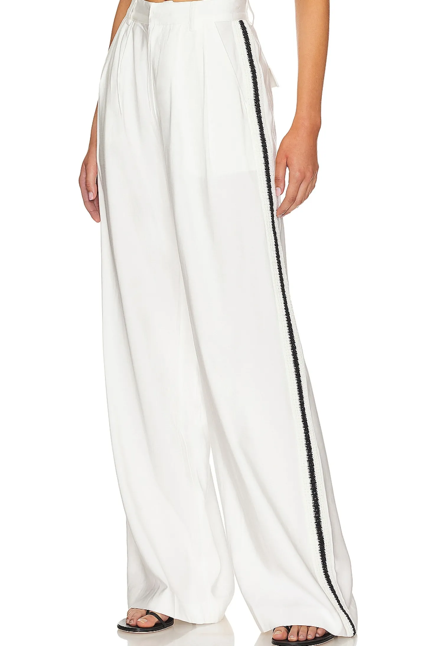 92% rayon 8% polyester.Made in China.Dry clean only.Zip fly with hook and bar closure.4-pocket design.Front pintuck detail.Knit fabric detail at side.22" at the knee and 22" at the leg opening