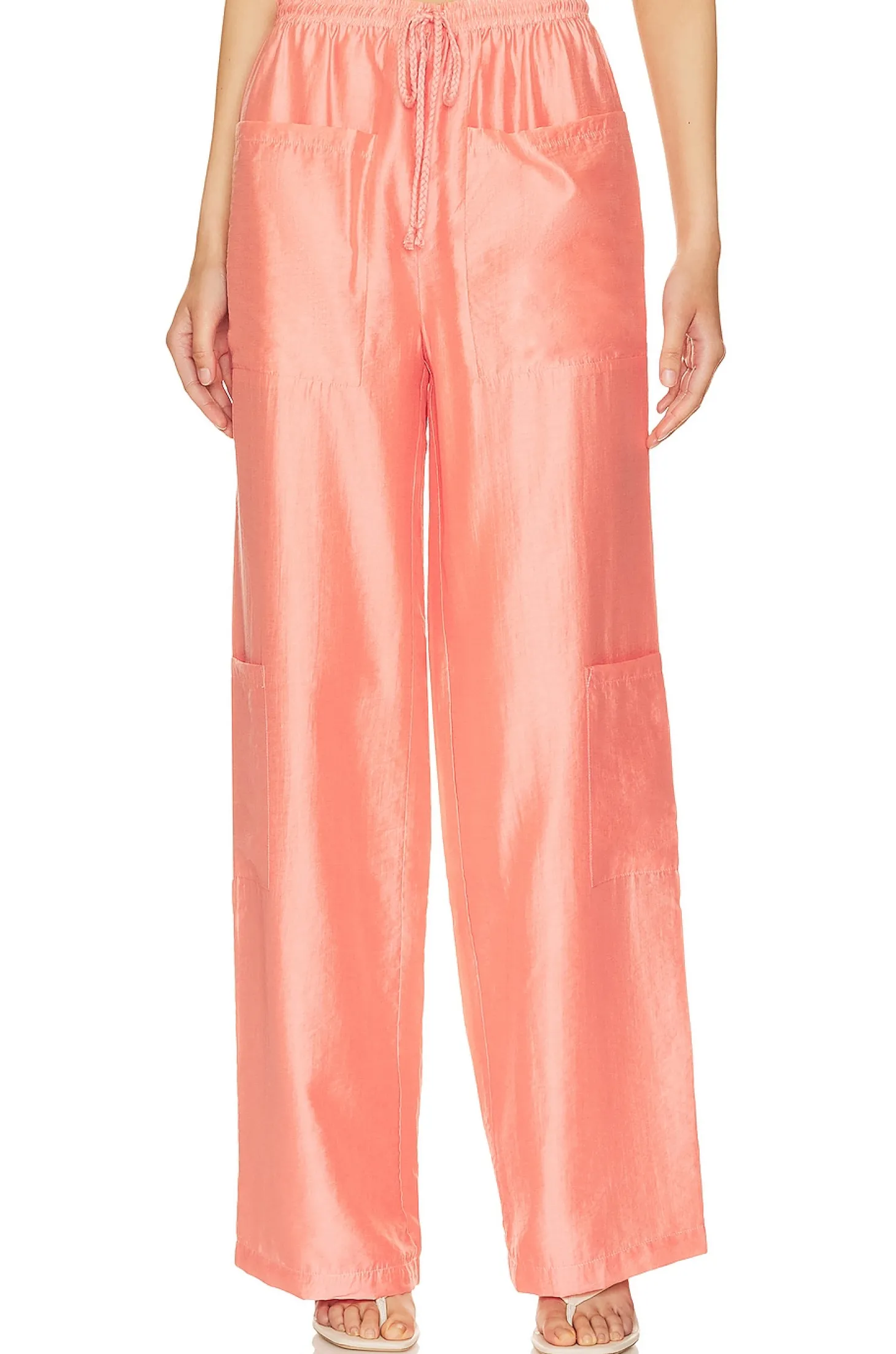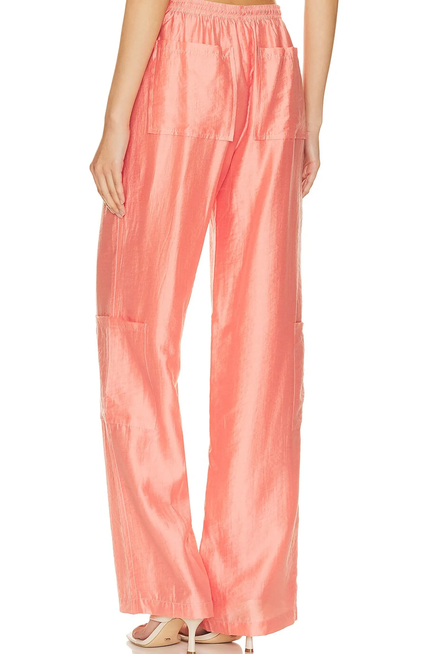 76% rayon 24% nylon.Made in China.Dry clean only.Elastic waistband with drawstring closure.Cargo style pockets.Sheen finish.22" at the knee and 22" at the leg opening