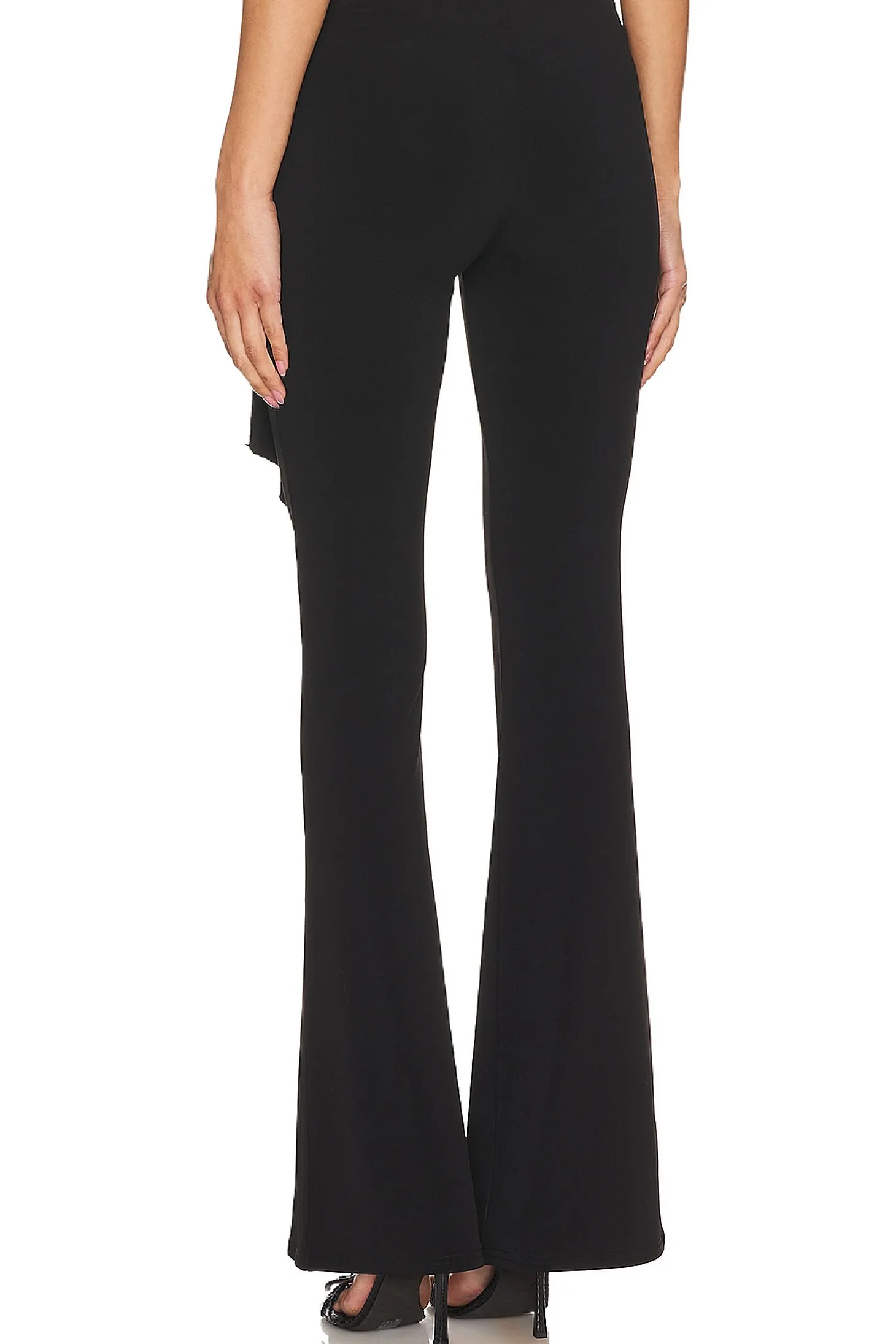 95% polyester 5% elastane.Made in China.Hand wash.Pull-on styling.Draped jersey fabric with silver-tone broche.Jersey fabric.Item not sold as set.14" at the knee breaks to 20" at the leg opening