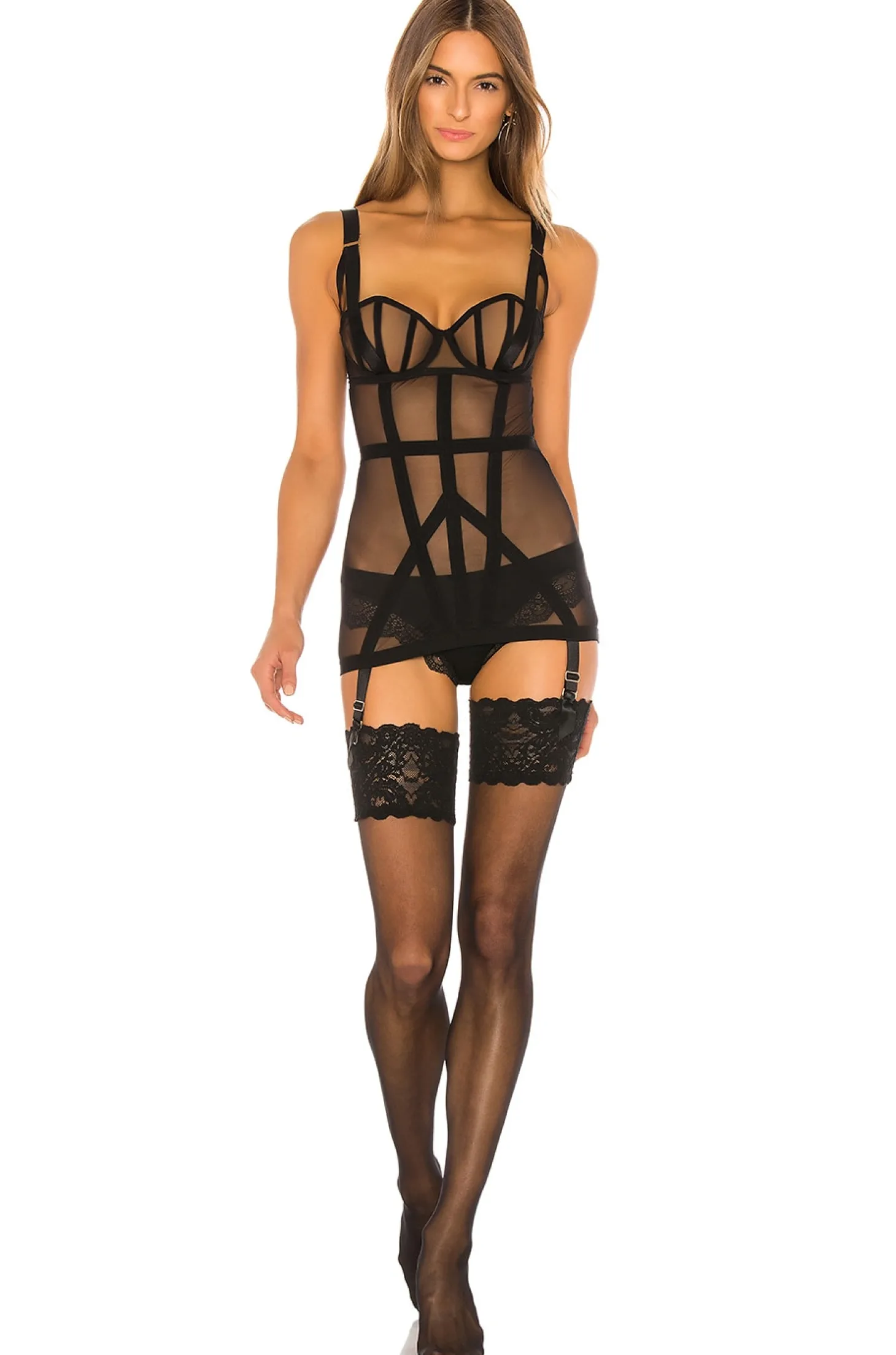 87% poly 13% elastane.Hand wash cold.Underwire cups.Back hook and eye closure.Adjustable shoulder straps.Adjustable garter belt straps with satin ribbon.Imported