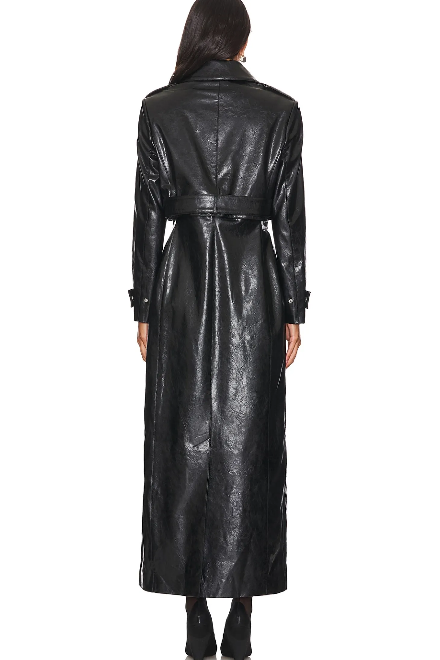 Outer shell: 100% polyurethane Backing: 100% viscose Lining: 55% polyester 45% viscose.Made in China.Dry clean.Front button closure.Zipper closure at upper.Detachable faux leather waist belt.3-pocket styling.Crinkled faux leather
