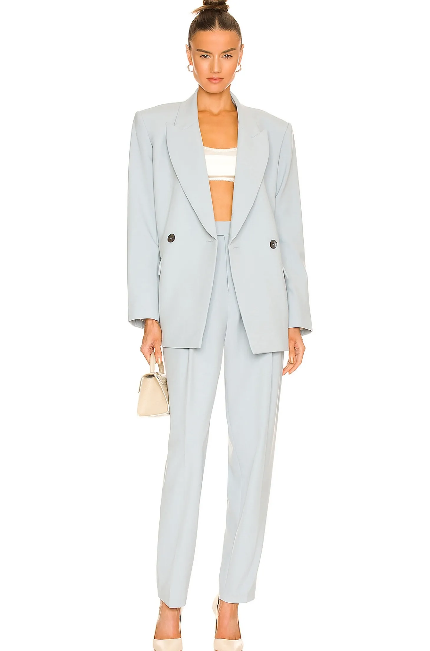 Self: 68% poly 29% viscose 3% elastane Lining: 55% poly 45% rayon.Made in China.Dry clean only.Double breast front button closure.Padded shoulders with buttoned cuffs.Front flap pockets.Back vent.Item not sold as a set
