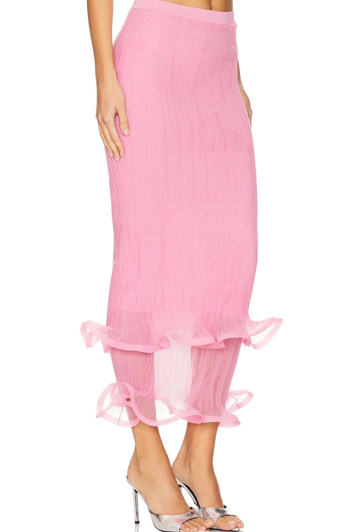 Self: 100% polyester Lining: 85% rayon 13% polyester 2% nylon.Made in China.Dry clean only.Fully lined.Pull-on styling with elastic waistband.Slinky gauze fabric.Item not sold as set Garment is made with a semi-sheer fabric, undergarments can show through.Skirt measures approx 37" in length