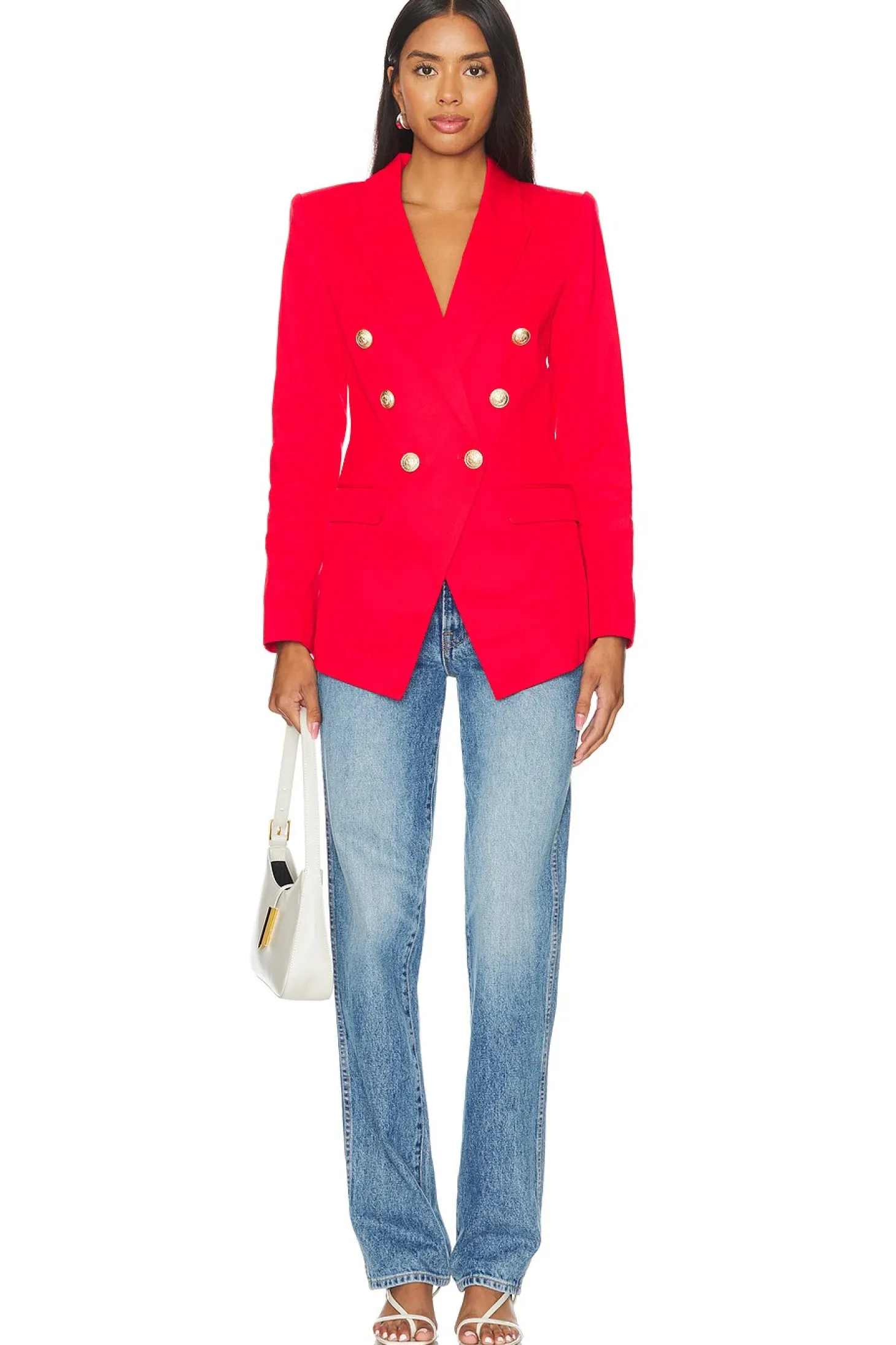 Self: 100% cotton Lining: 100% polyester.Made in China.Dry clean.Single-breasted with front button closure.Front flap pockets Buttoned cuffs.Buttoned cuffs Padded shoulders.Linen fabric with satin lining