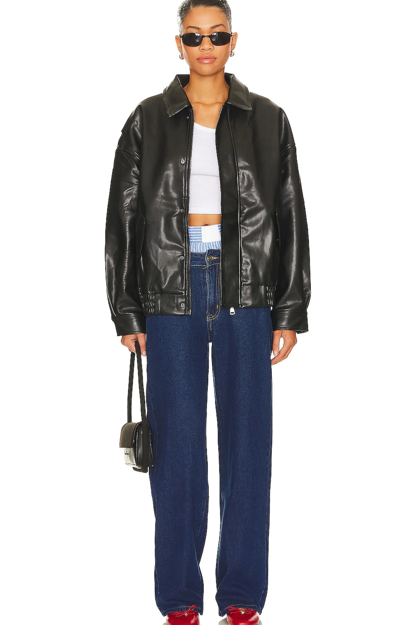 55% polyurethane 45% polyester.Made in China.Hand wash.Front zipper with snap button placket.Side flap pockets.Buttoned cuffs.Elastic hem.Soft faux leather fabric