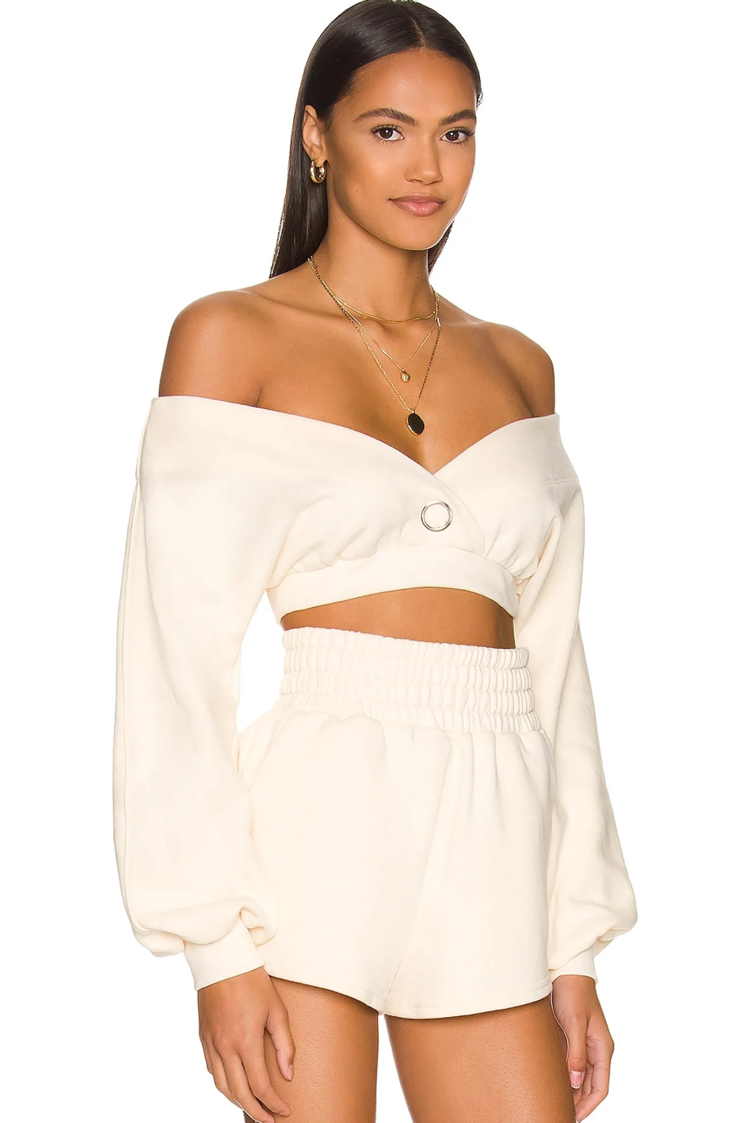 100% cotton.Made in USA.Machine wash.Singular front snap button closure.Off shoulder styling.French terrycloth fabric.Item not sold a set