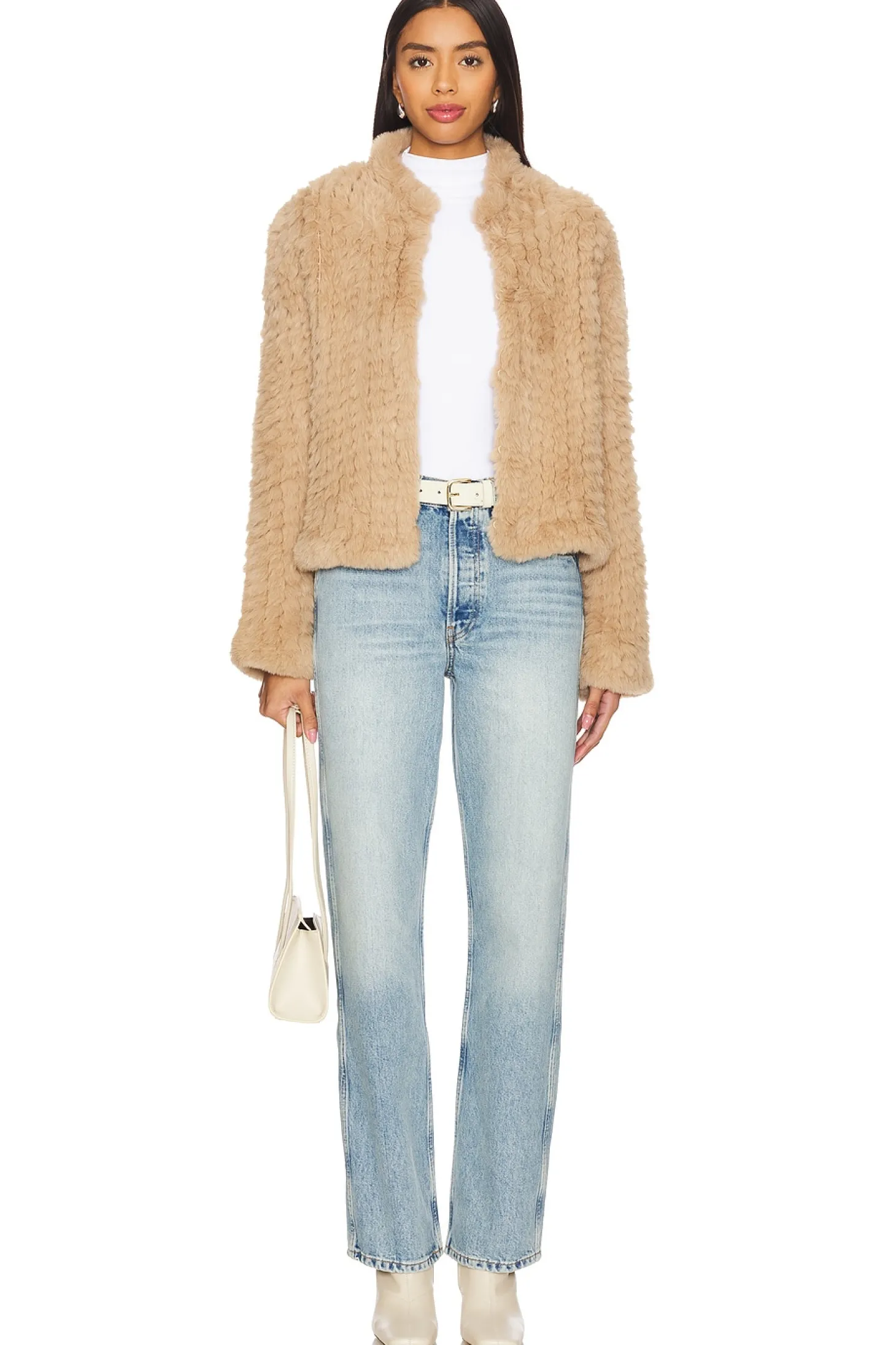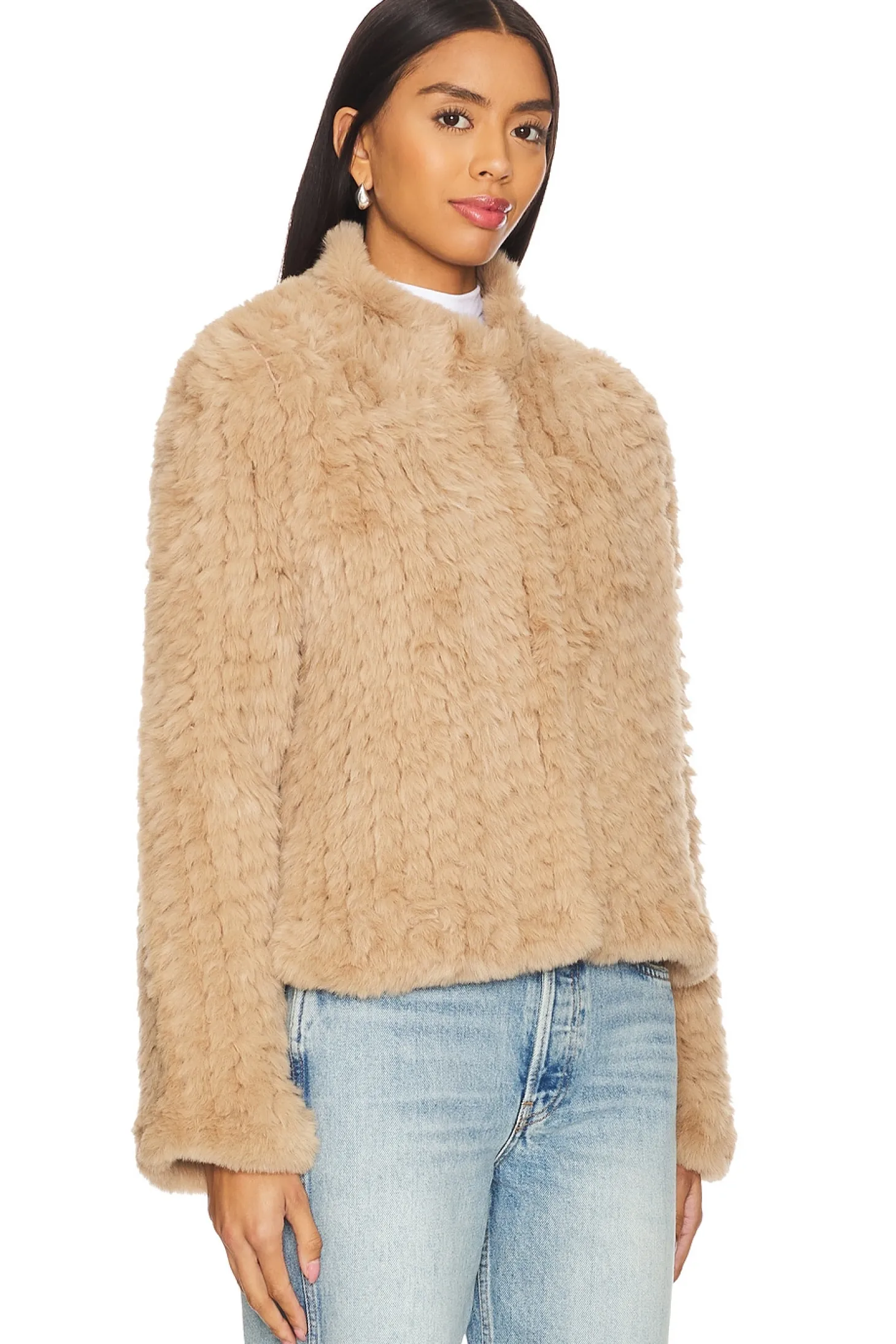 Self: Faux Fur: 100% polyester Contrast Fabric: 100% polyester.Made in China.Dry clean only.Front hook and eye closure.Faux fur exterior