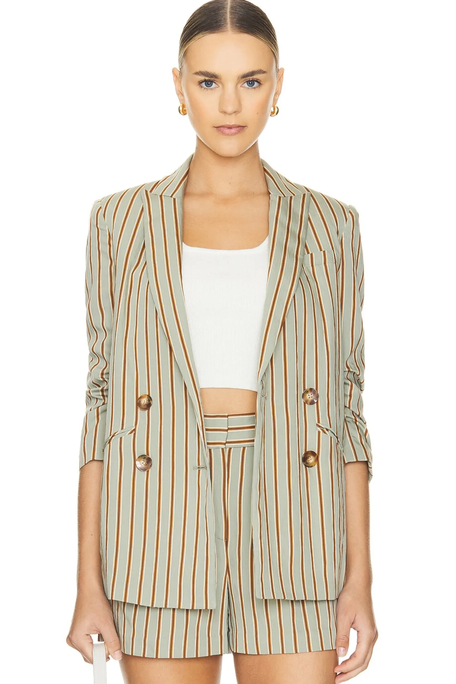 Self: 90% rayon 10% polyester Lining: 100% polyester.Made in USA.Dry clean only.Singular front button closure.Padded shoulders.3-pocket design.Button cuffs.Lightweight twill fabric Item not sold as a set