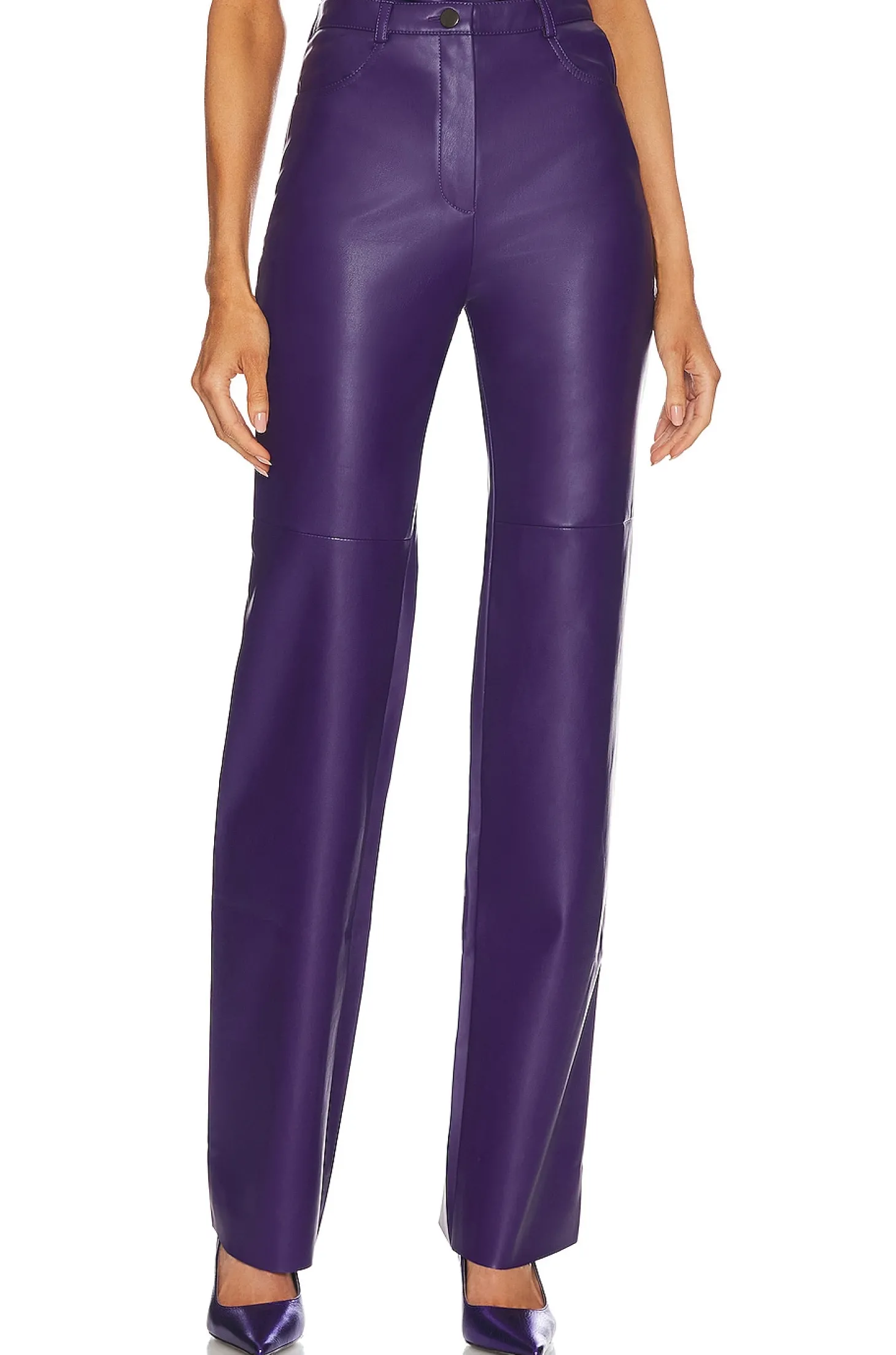56% recycled polyester 44% polyurethane.Made in Ukraine.Dry clean only.Zip fly with button closure.4-pocket styling.Faux leather fabric.Item not sold as a set.17" at the knee narrows to 16" at the leg opening