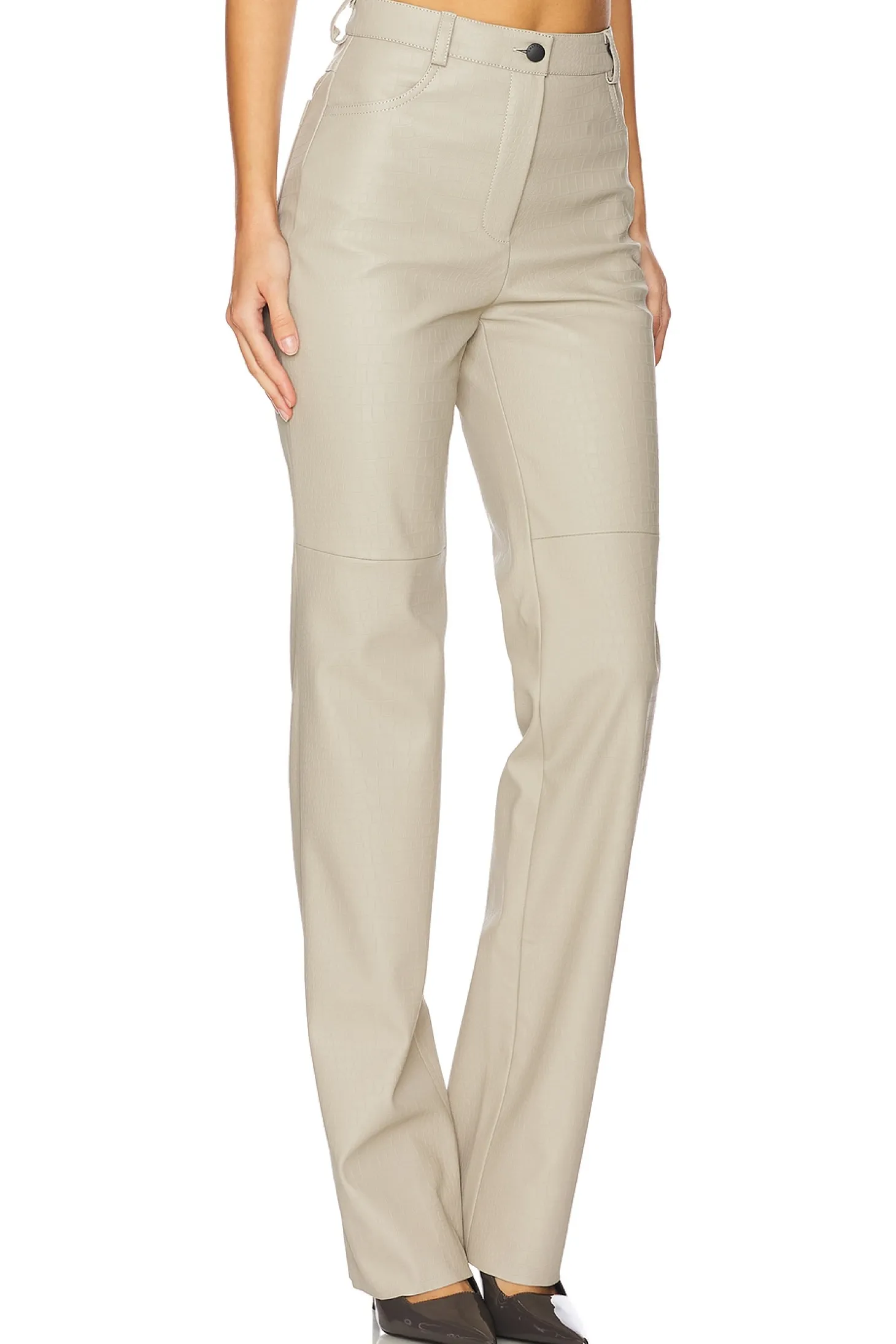 56% recycled polyester 44% polyurethane.Made in Ukraine.Dry clean only.Fly zip with button closure.4-pocket styling.Heavyweight faux leather fabric Item not sold as a set.16" at the knee and 16" at the leg opening