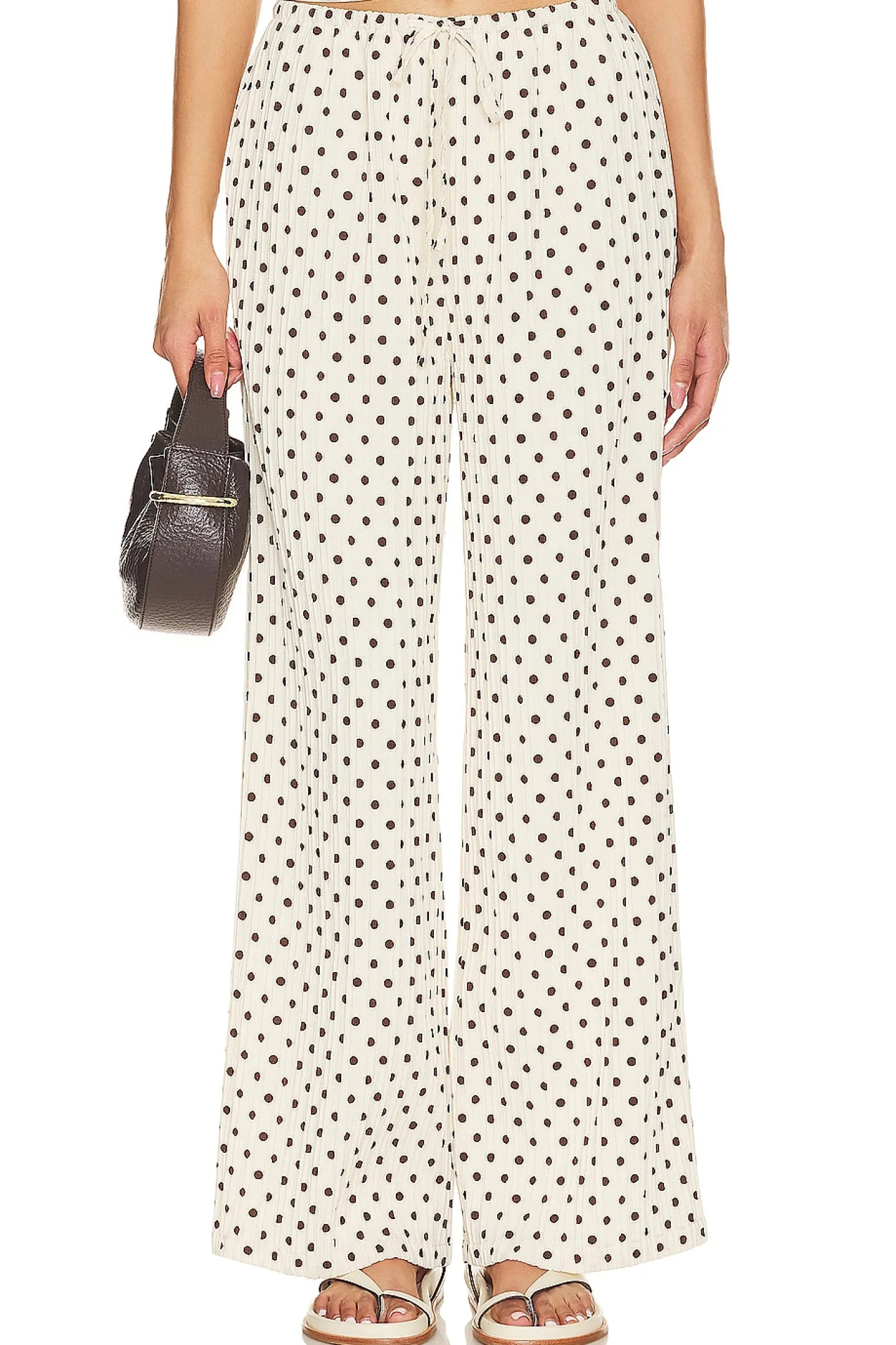 100% polyester.Made in China.Dry clean.Pull-on styling with elastic waistband and front drawstring tie closure.Side seam pockets.Lightly pleated voile fabric.23.5" at the knee narrows to 22.5" at the leg opening Size S measures appox 27" in waist circumference