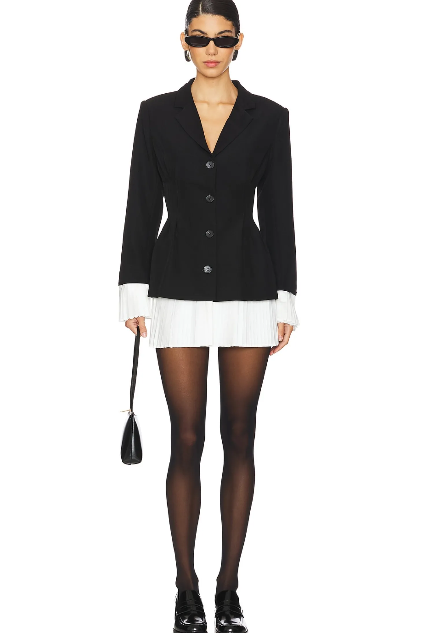 Self: 92% polyester 8% spandex Lining:100% polyester Contrast: 80% polyester 20% cotton.Made in China.Dry clean only.Front button closure.Pleated detail at waist and pleated skirt contrast.Buttoned cuffs with detachable contrast.Crepe fabric with padded shoulders