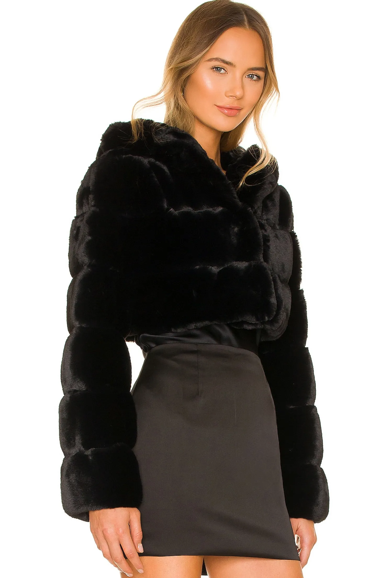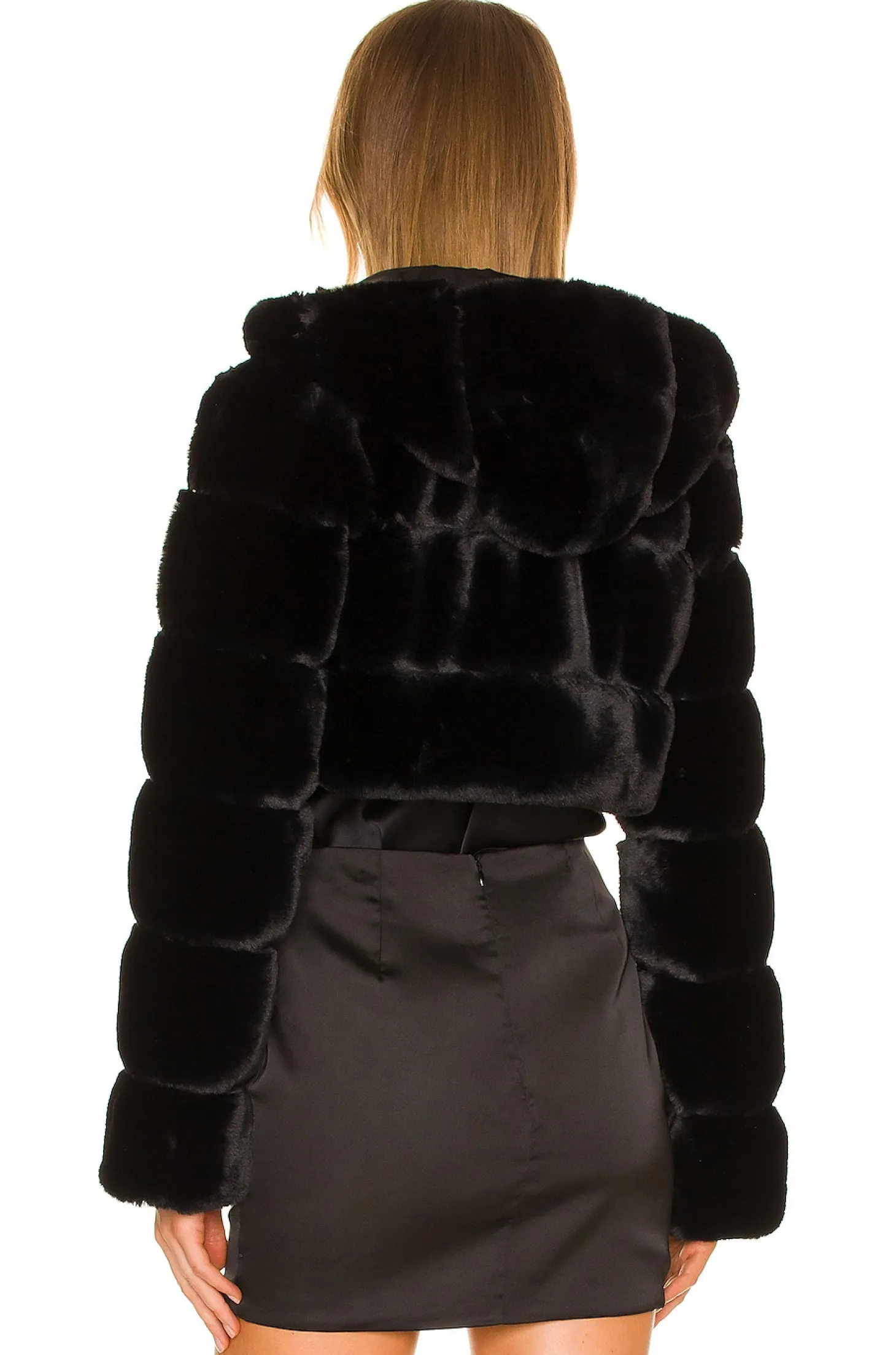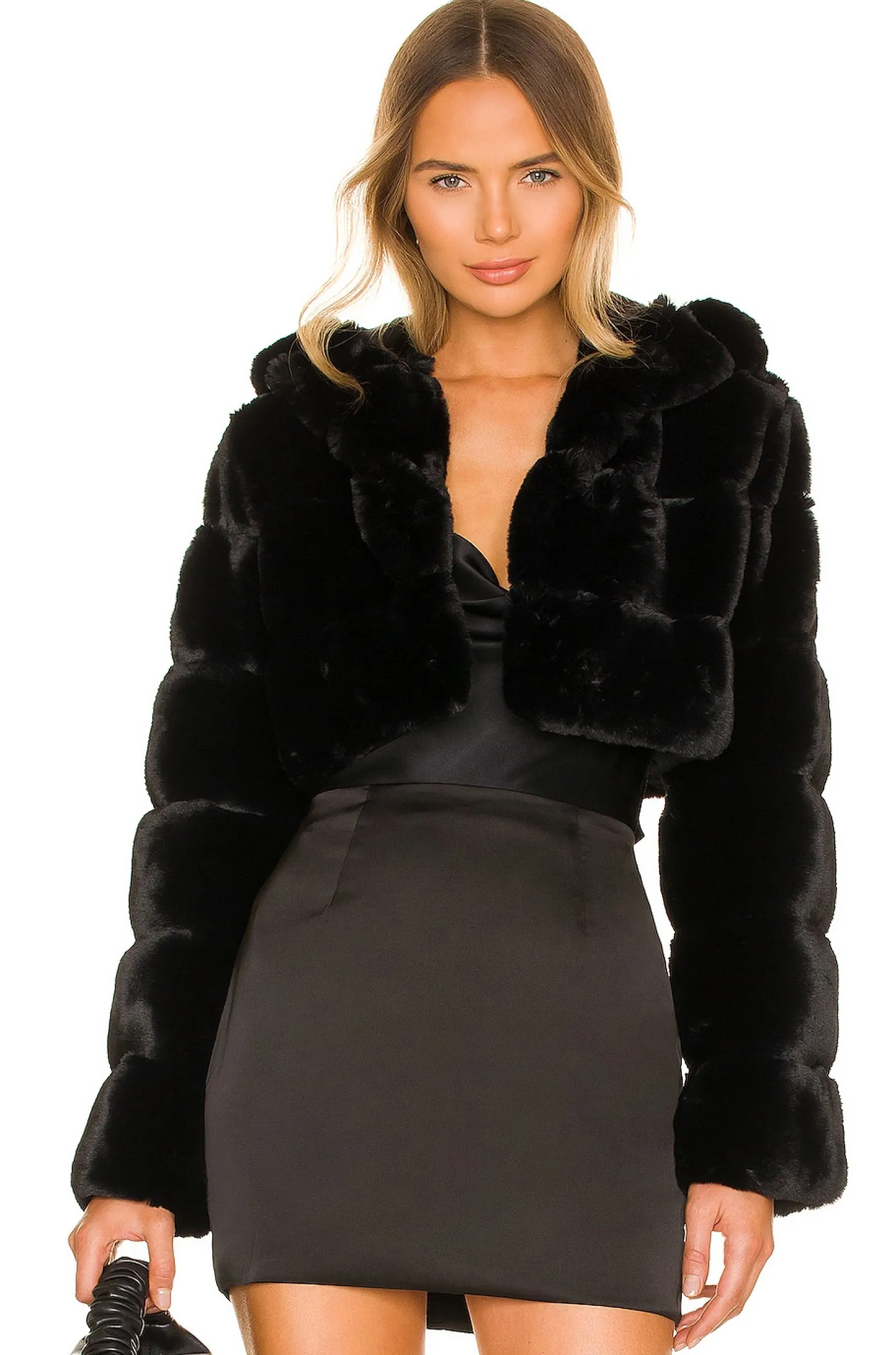 100% poly.Made in China.Dry clean only.Front hook and eye closure.Plush, soft faux fur fabric