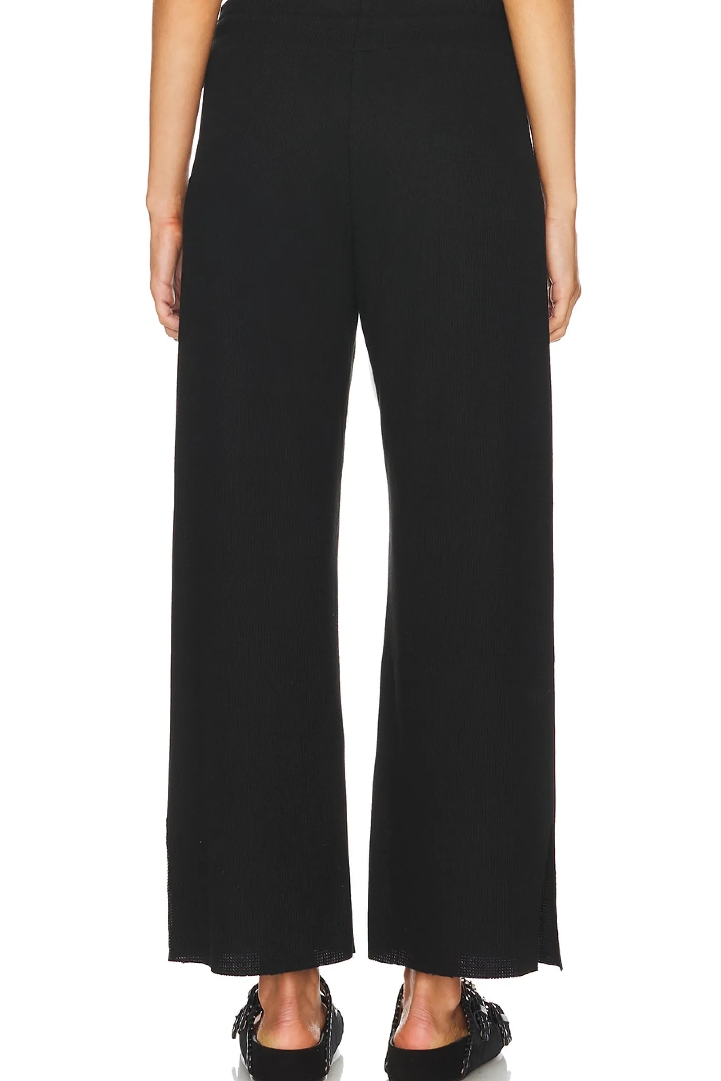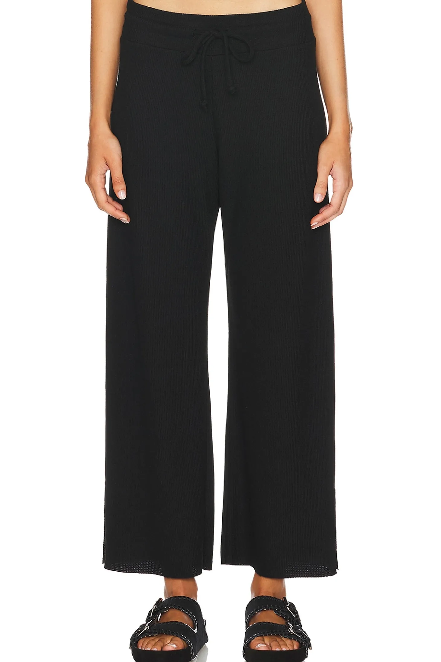 68% polyester 31% rayon 1% spandex.Made in China.Machine wash.Elastic waistband and drawstring.Jersey fabric with slit hem.21" at the knee and 21" at the leg opening