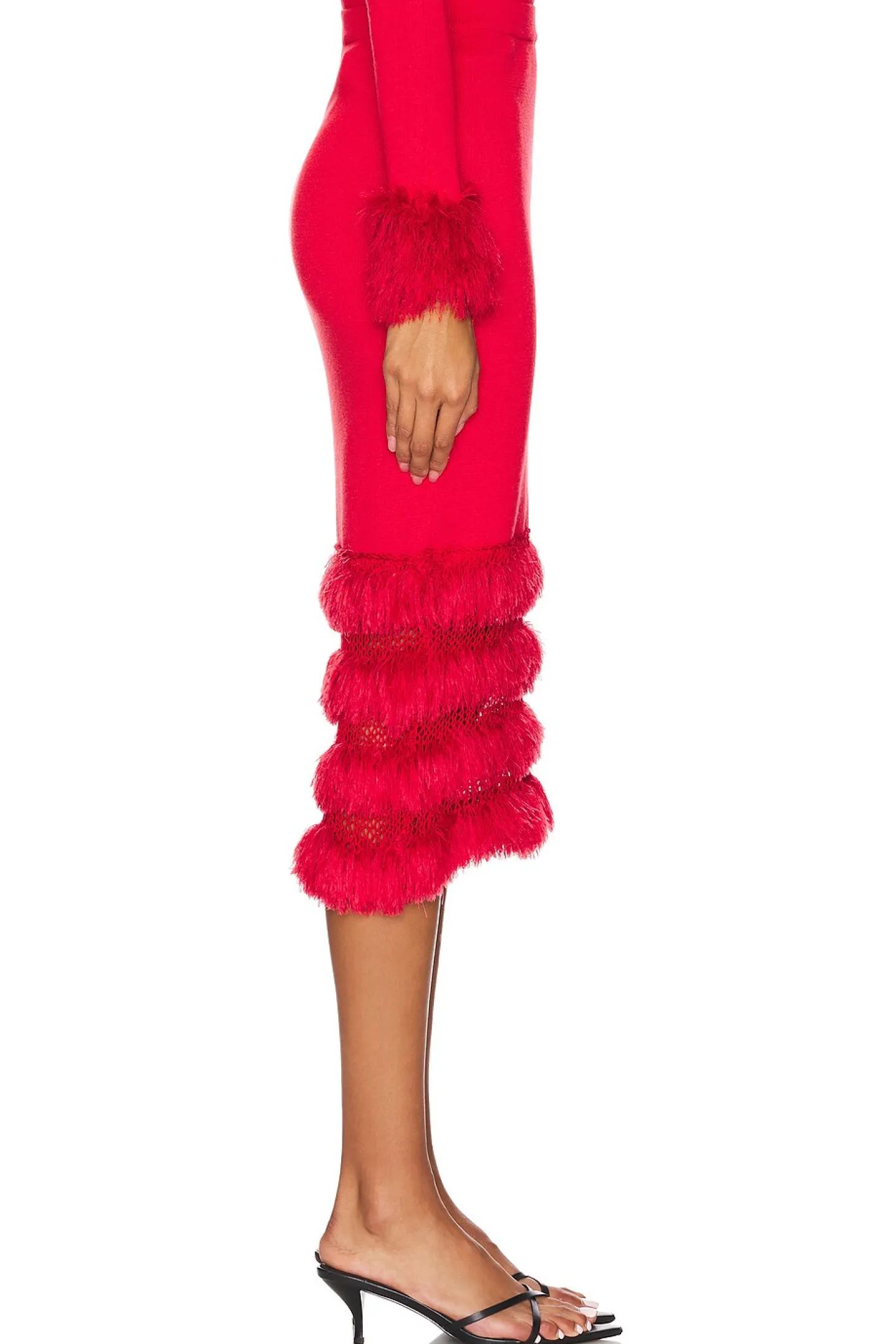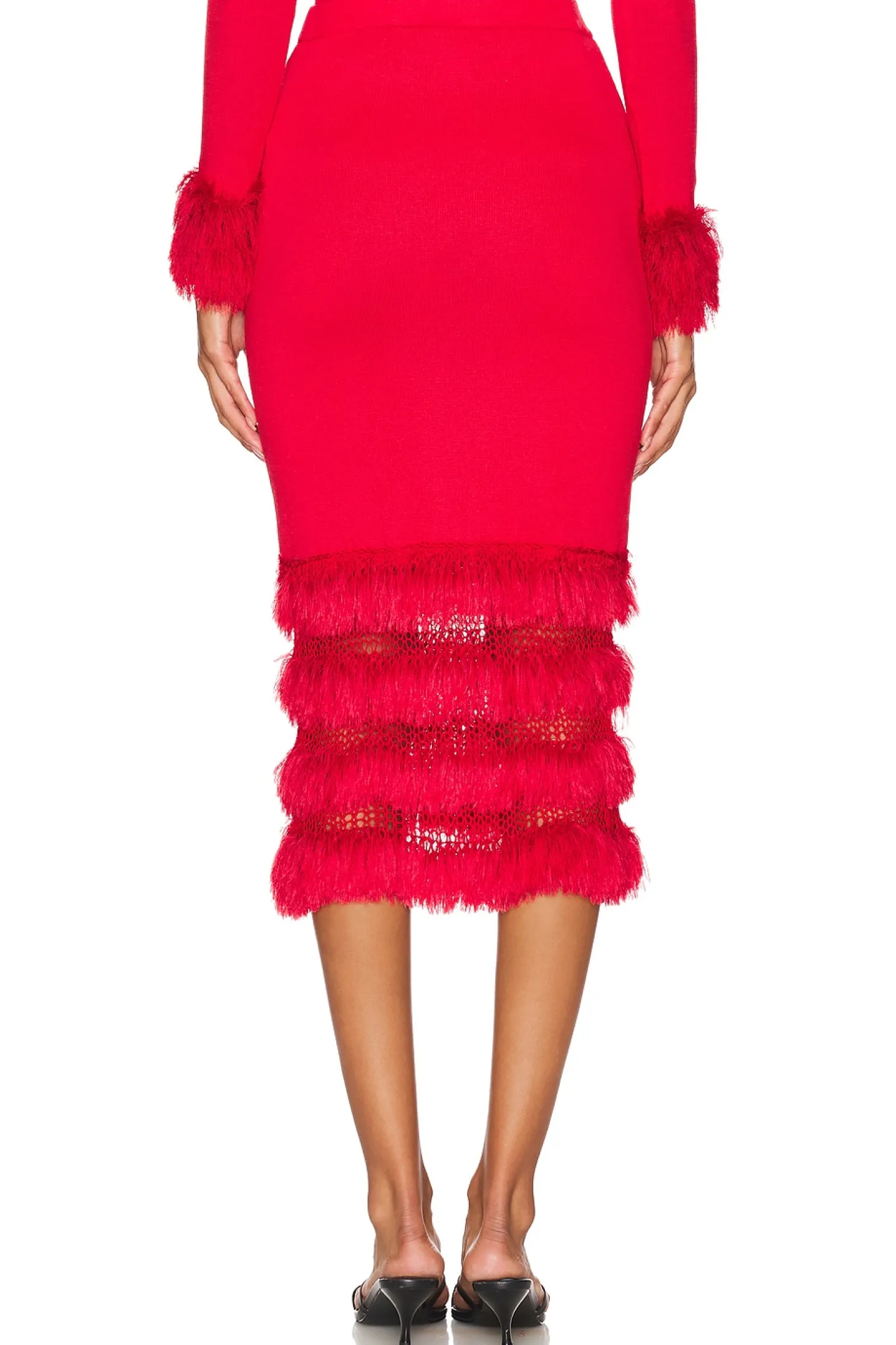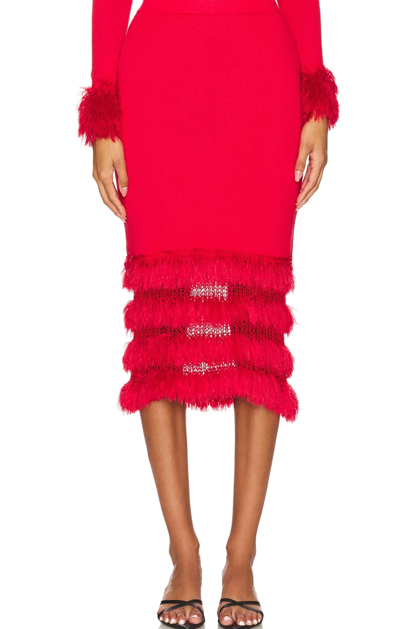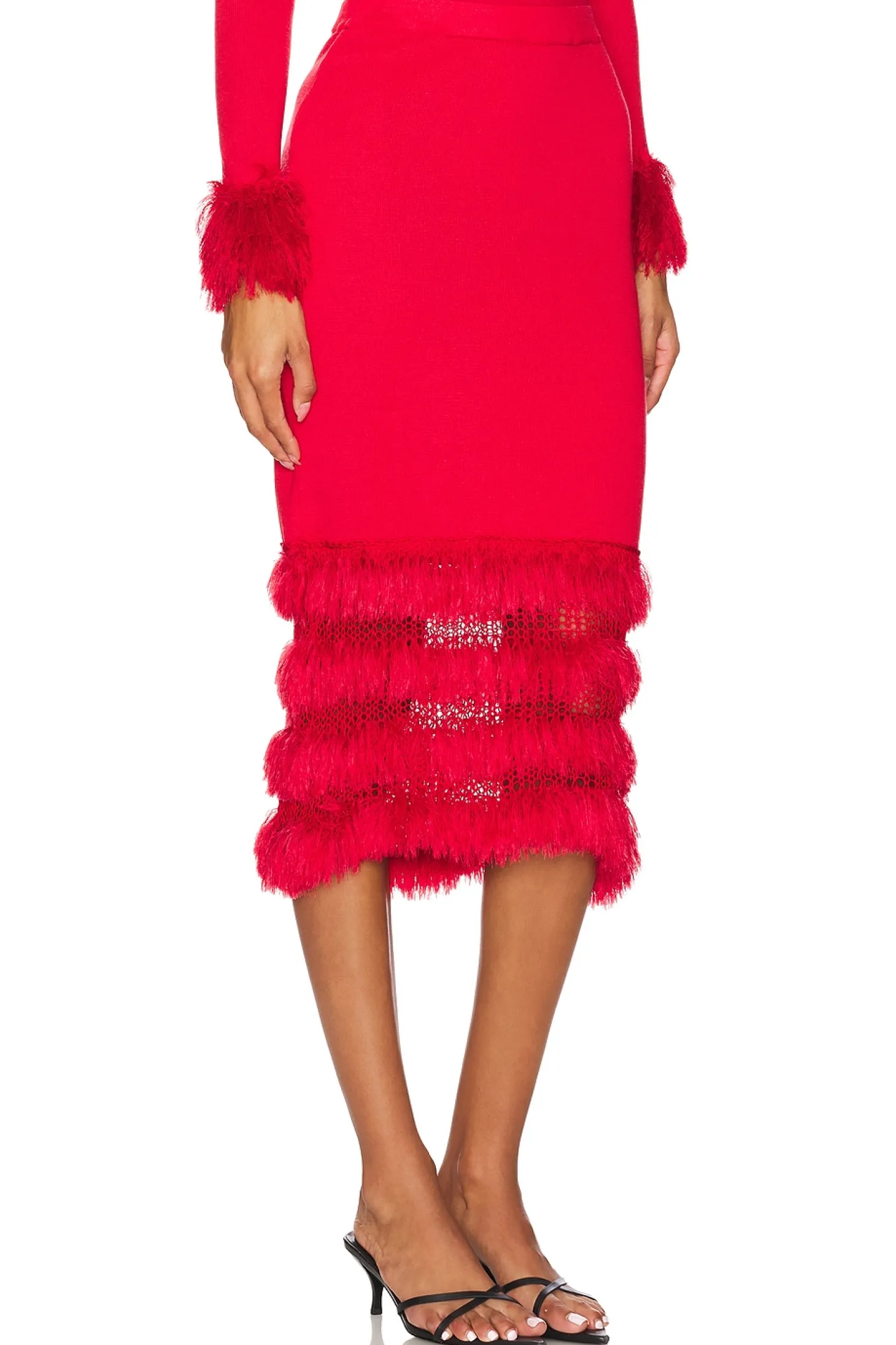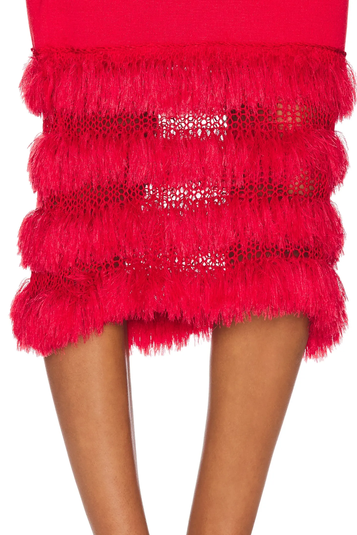 50% cotton 50% viscose.Made in Ukraine.Dry clean only.Unlined.Pull-on styling with elastic waistband.Knit fabric with crochet knit hem and tiered fringe.Item not sold as set.Skirt measures approx 31" in length