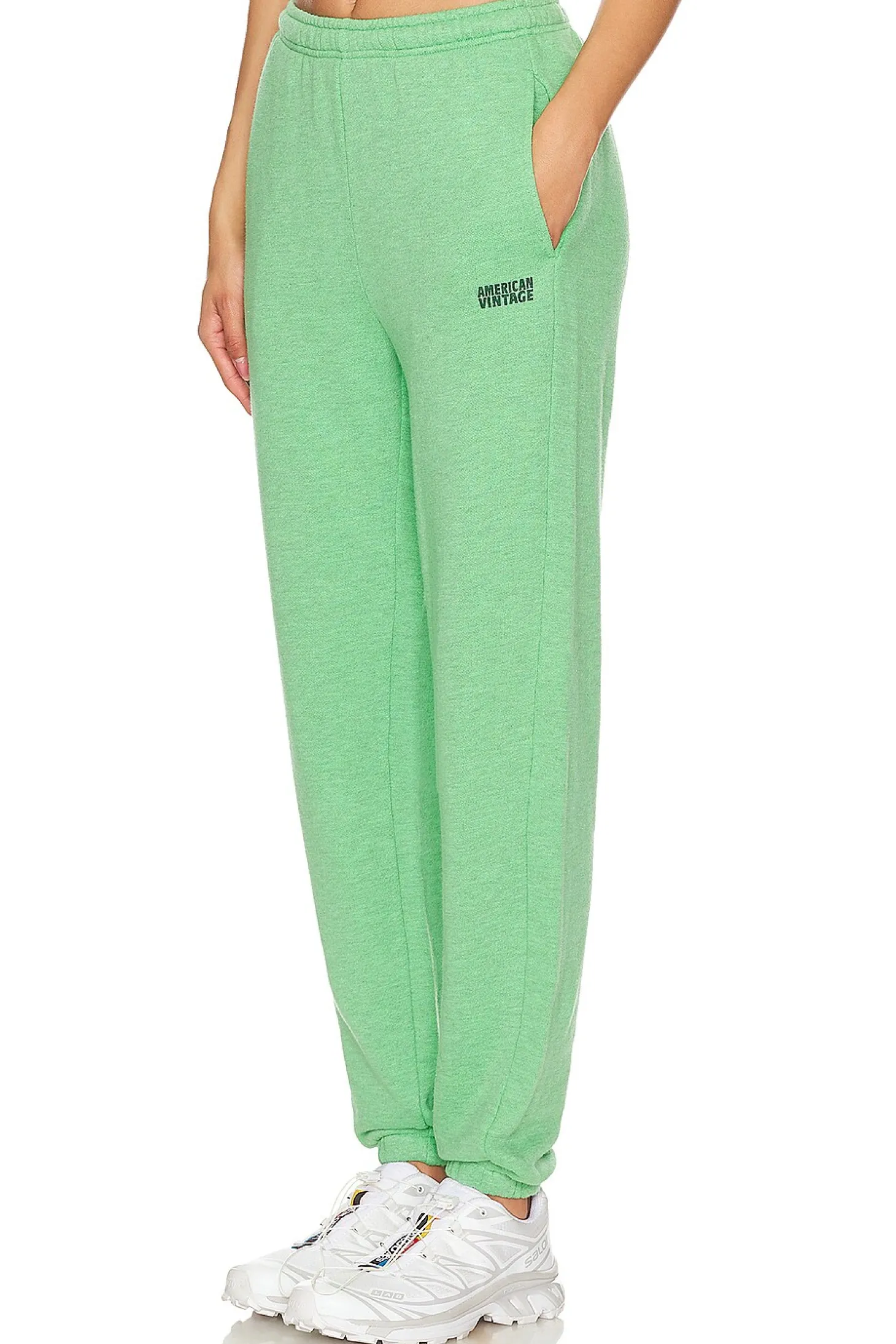 88% cotton 12% polyester.Made in Portugal.Machine wash.Pull-on styling with elastic waistband and interior drawstring tie closure.Side seam pockets.Screenprinted American Vintage logo at left leg.Fleece fabric with cinched cuffs Item not sold as a set.15" at the knee narrows to 9" at the leg opening