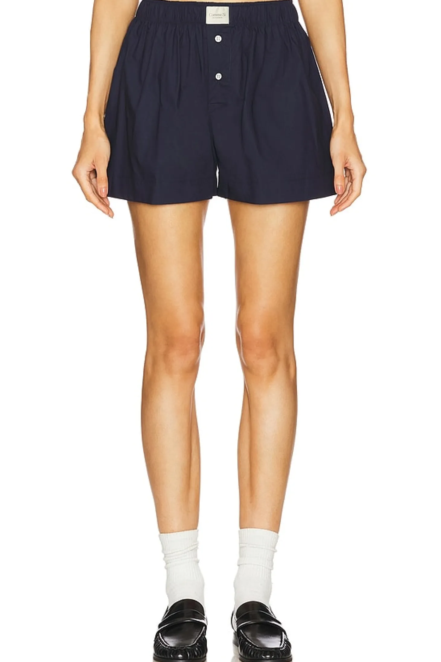 100% cotton.Made in Canada.Machine wash.Elastic waistband with brand logo.Faux button fly.Airy fabric.Shorts measure approx 13.5" in length