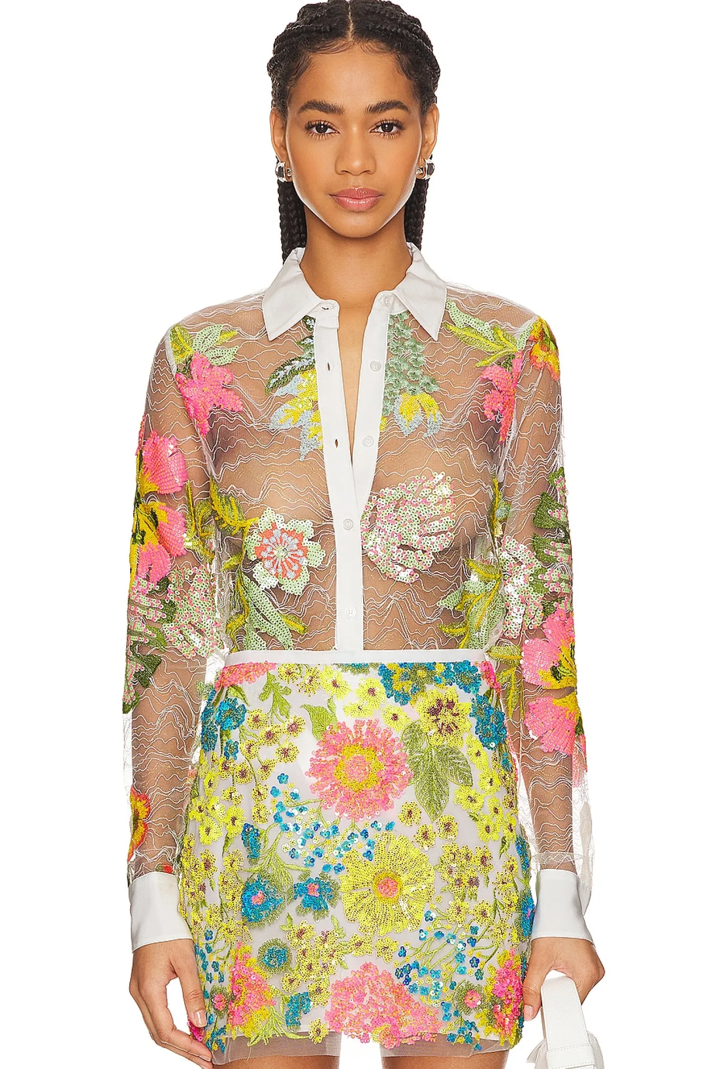 100% polyester.Made in China.Hand wash.Front button closure.Blouson sleeves with button cuffs.Lightweight mesh fabric with sequin embellishments.Item not sold as a set