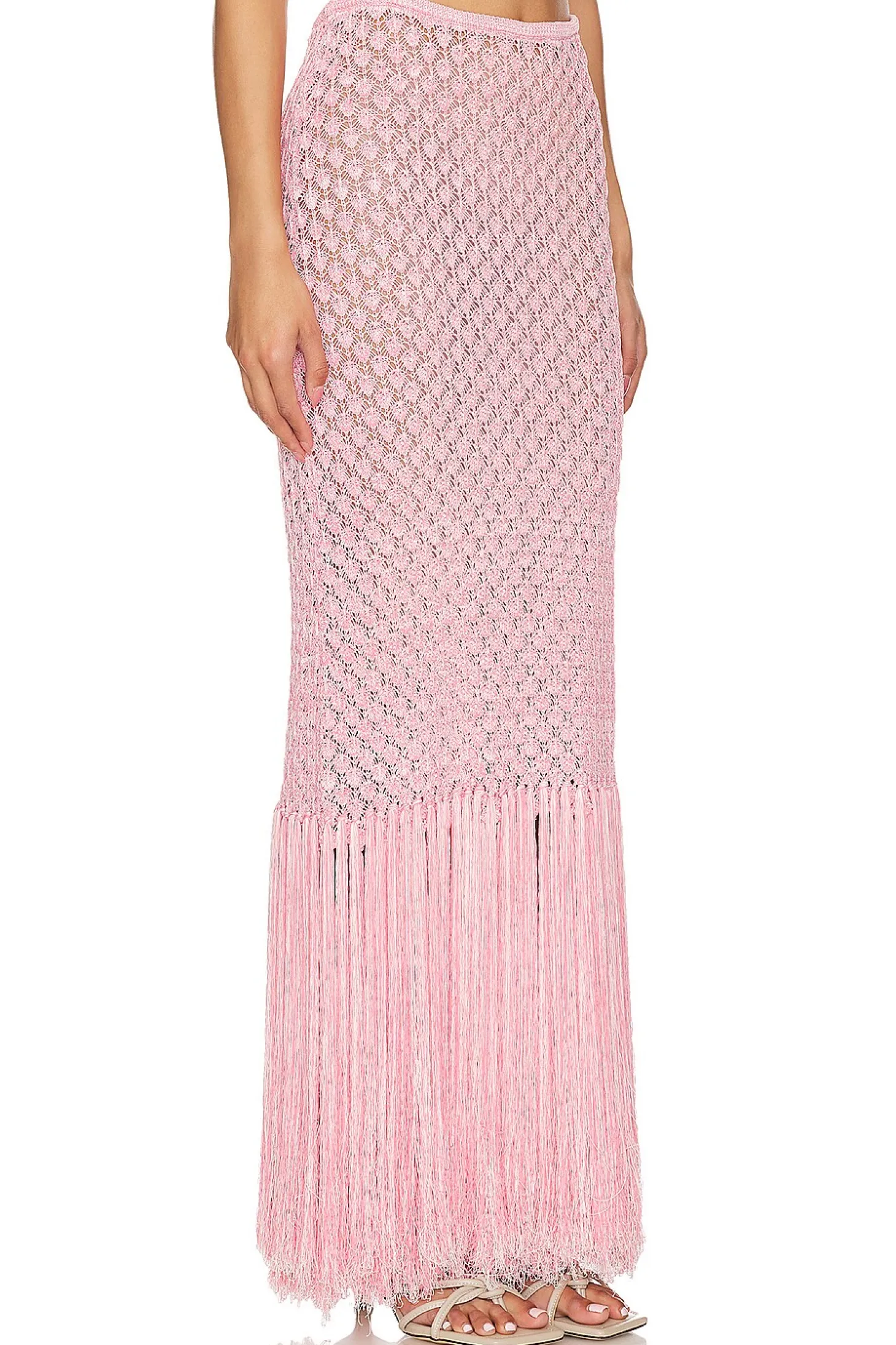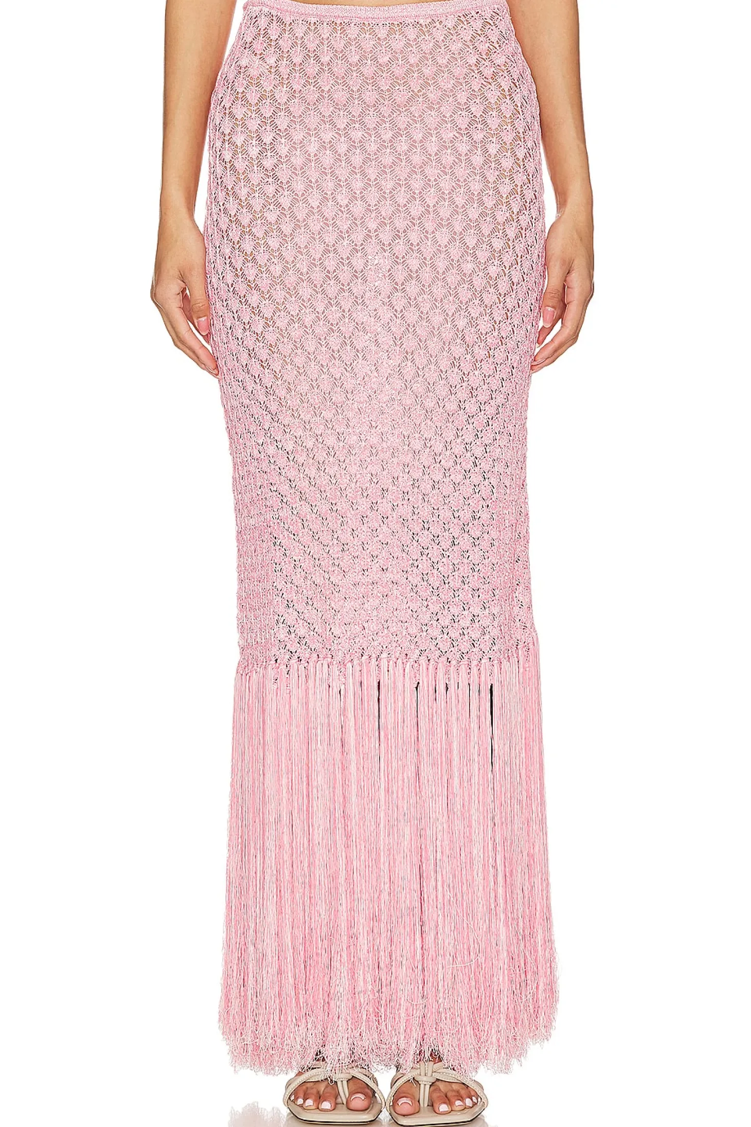 63% viscose 37% nylon.Made in China.Hand wash.Unlined.Pull-on styling with elastic waistband.Garment is intentionally sheer, undergarments will show through. Please note undergarment not included.Open crochet knit fabric with fringe hem Item not sold as set.Skirt measures approx 43" in length Size S waist circumference measures approx 28"