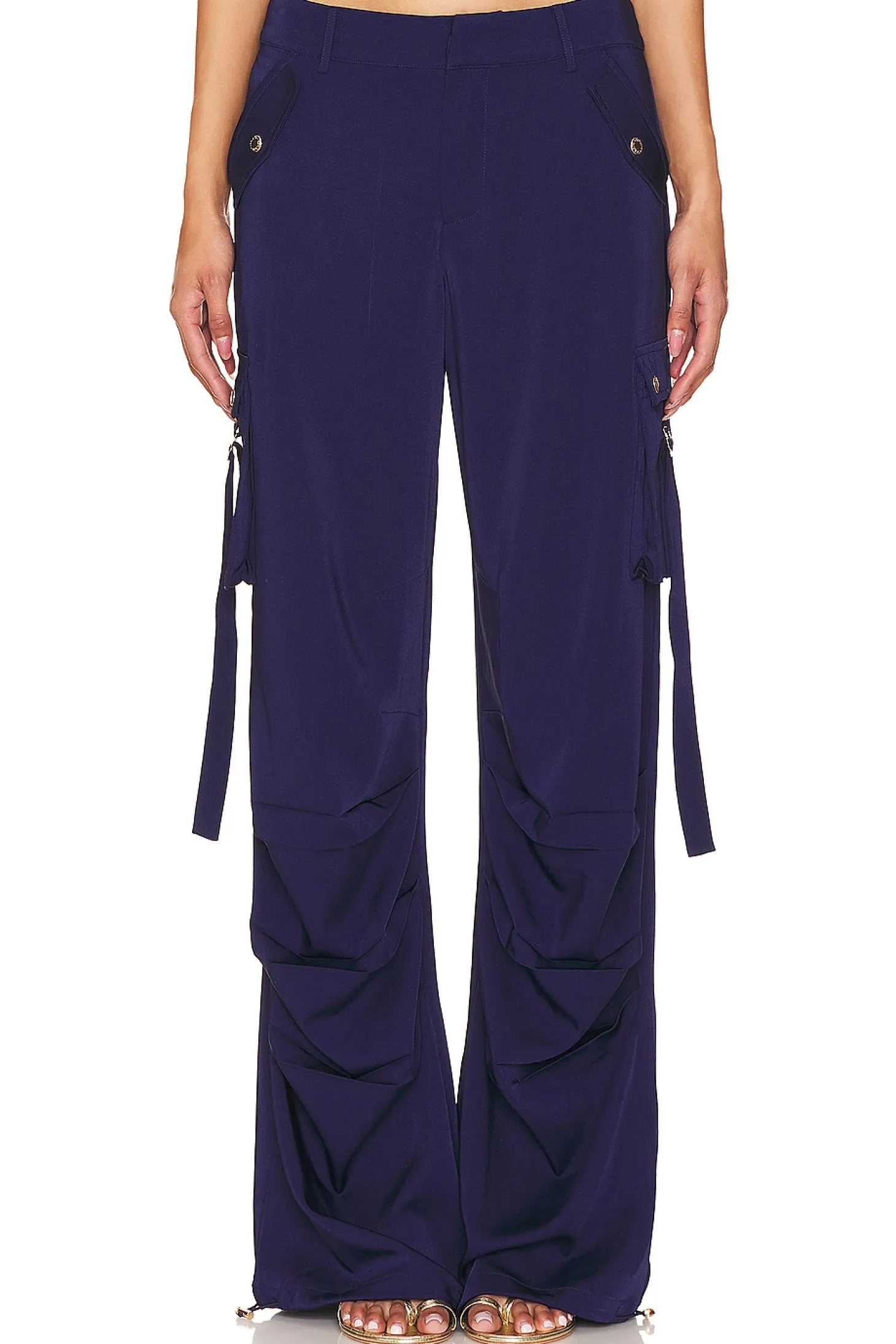 100% polyester.Made in China.Hand wash.Zip fly with hook and bar closure.Strappy detail.6-pocket styling includes two cargo button pockets.Satin fabric with drawcord hem Item not sold as set.20" at the knee narrows to 14" at the leg opening