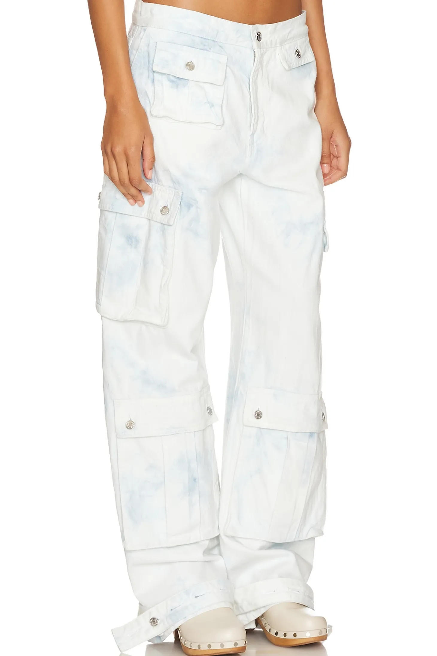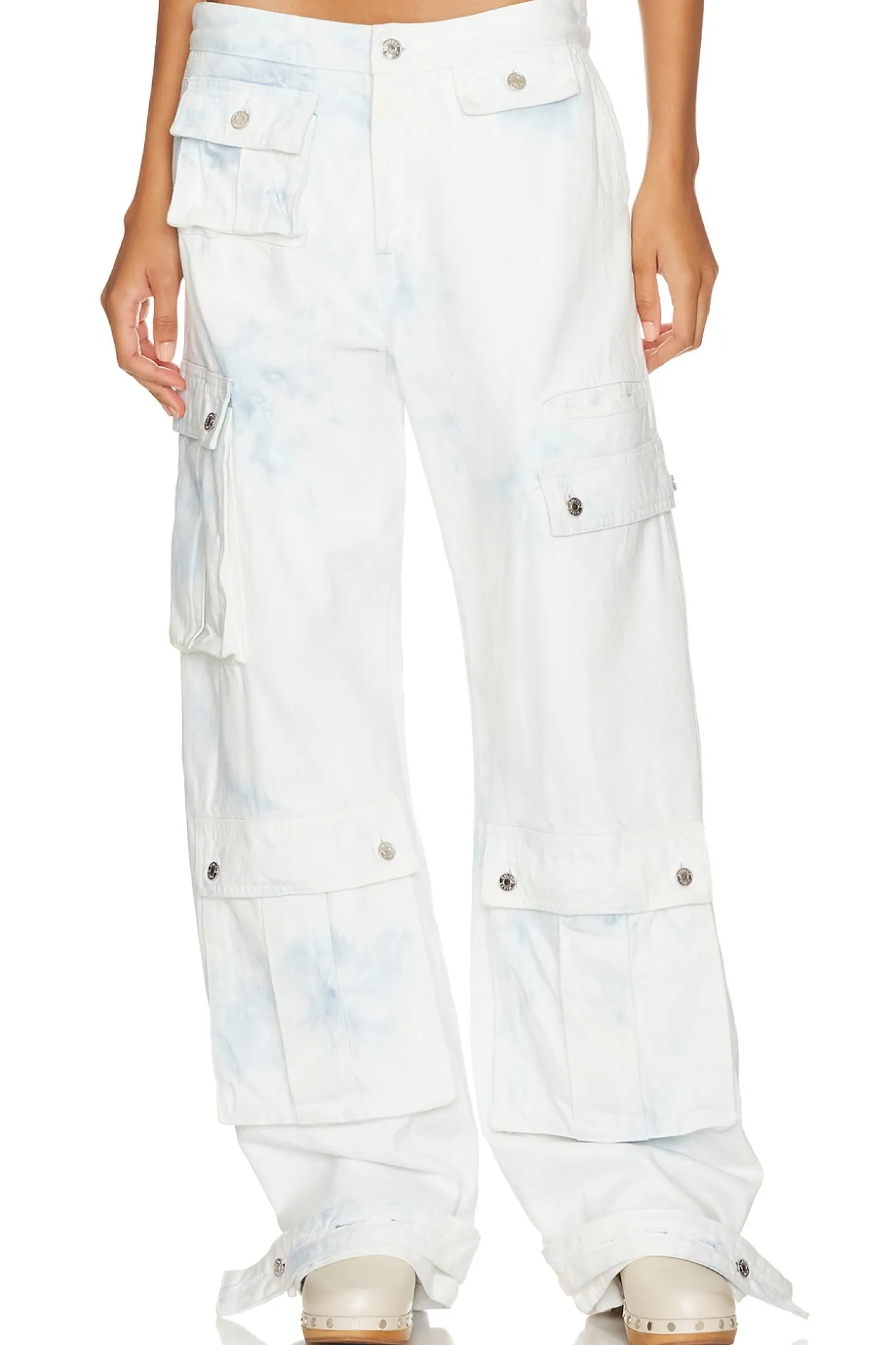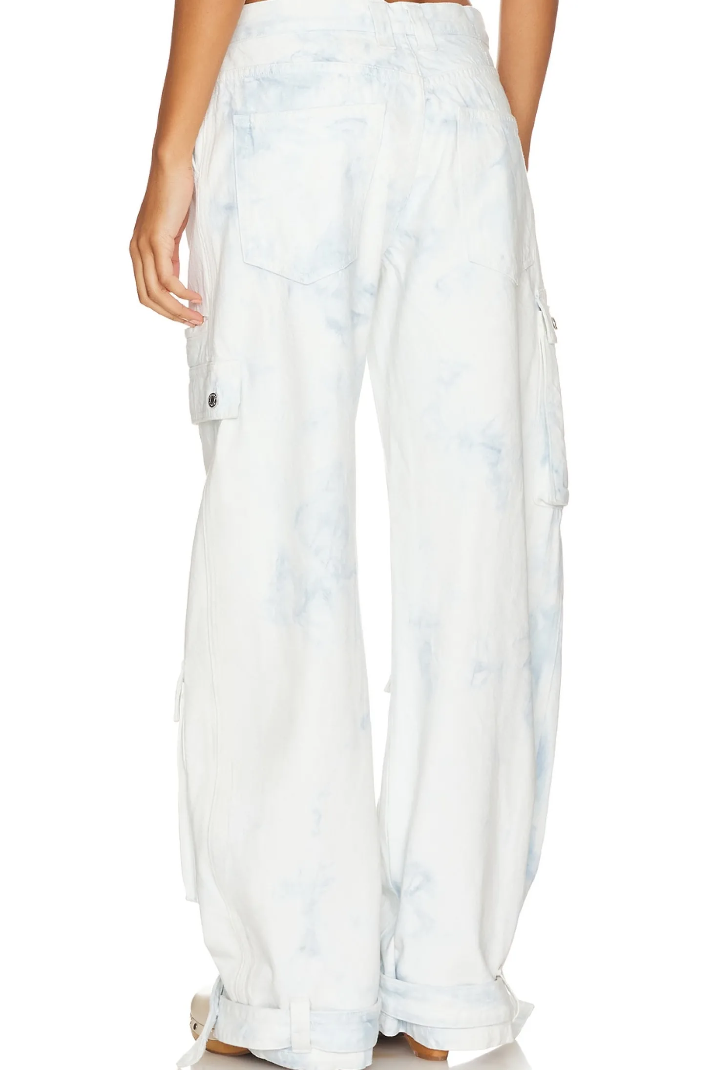 GRLFRND's Lara in Airwaves is the perfect cargo pant to add to your denim collection. The low rise fit accentuates your curves, while the 10-pocket design creates an edgy 90's-inspired look with a twist of modern-day street style. The relaxed, oversized fit makes it easy to pair with any top. Each GRLFRND style is unique. Due to the use of reclaimed vintage fabrics, details and colors vary throughout to ensure that each piece is uniquely its own..Cotton blend.Imported.Machine wash recommended.Zip fly with button closure.6-pocket design