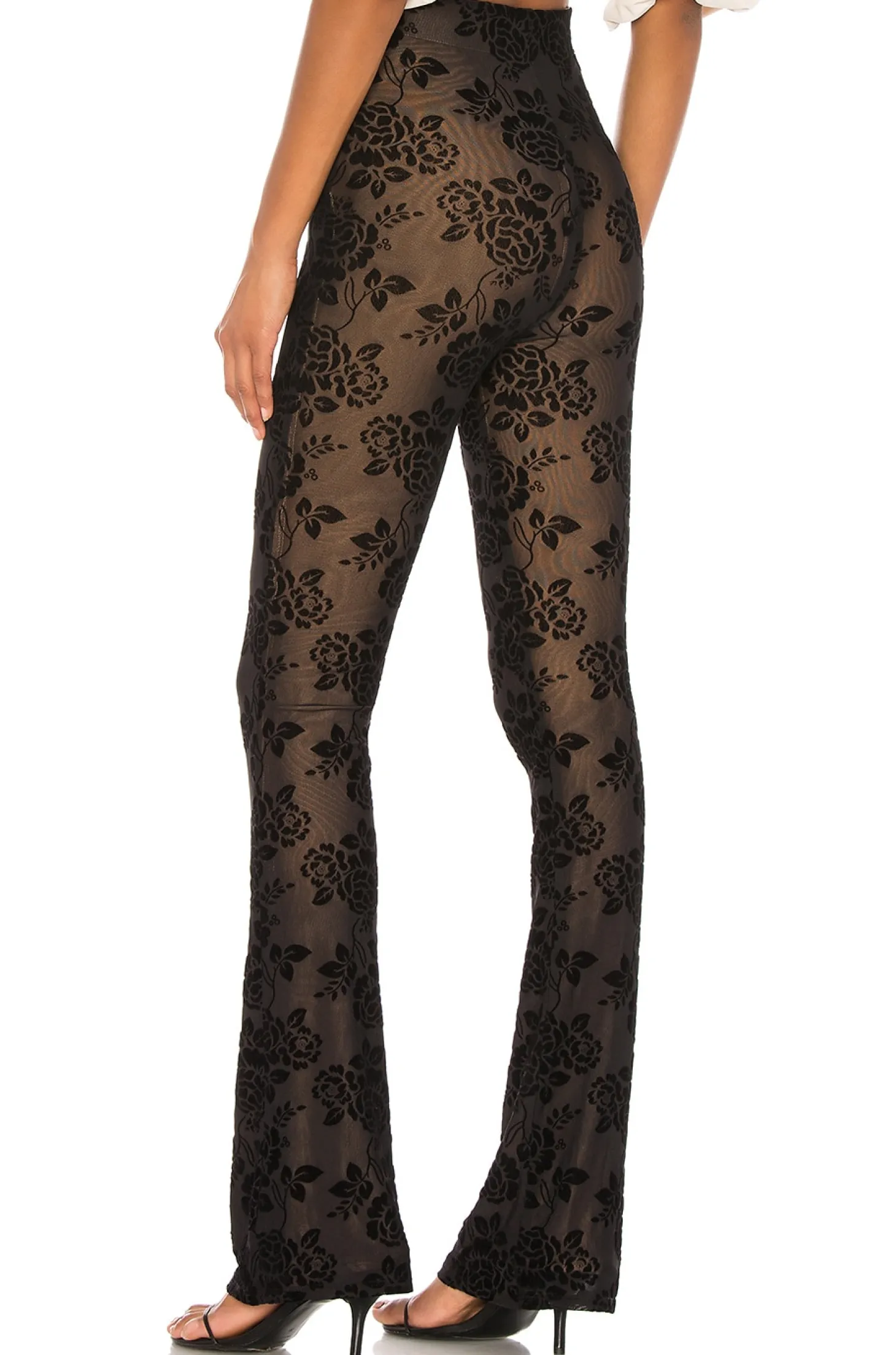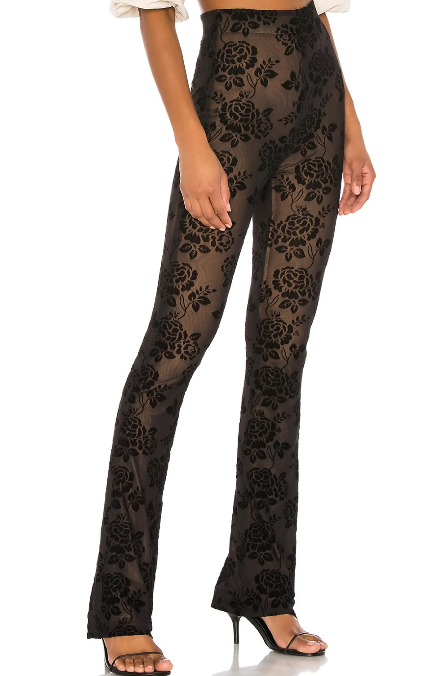 Self: 95% poly 5% elastane Lining: 100% poly.Hand wash cold.Burnout fabric.Elasticized waistband.12" at the knee breaks to 16" at the leg opening.Imported