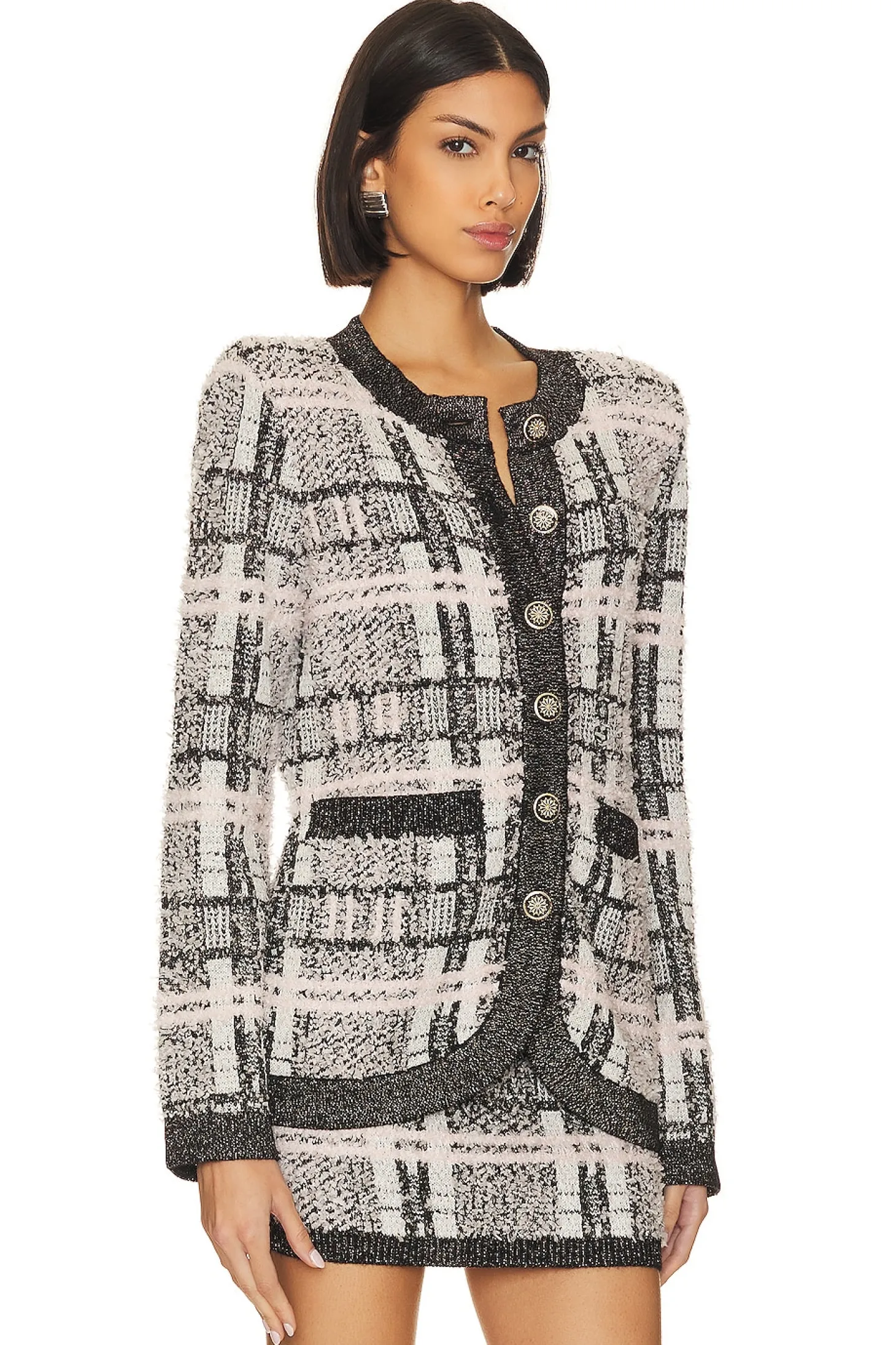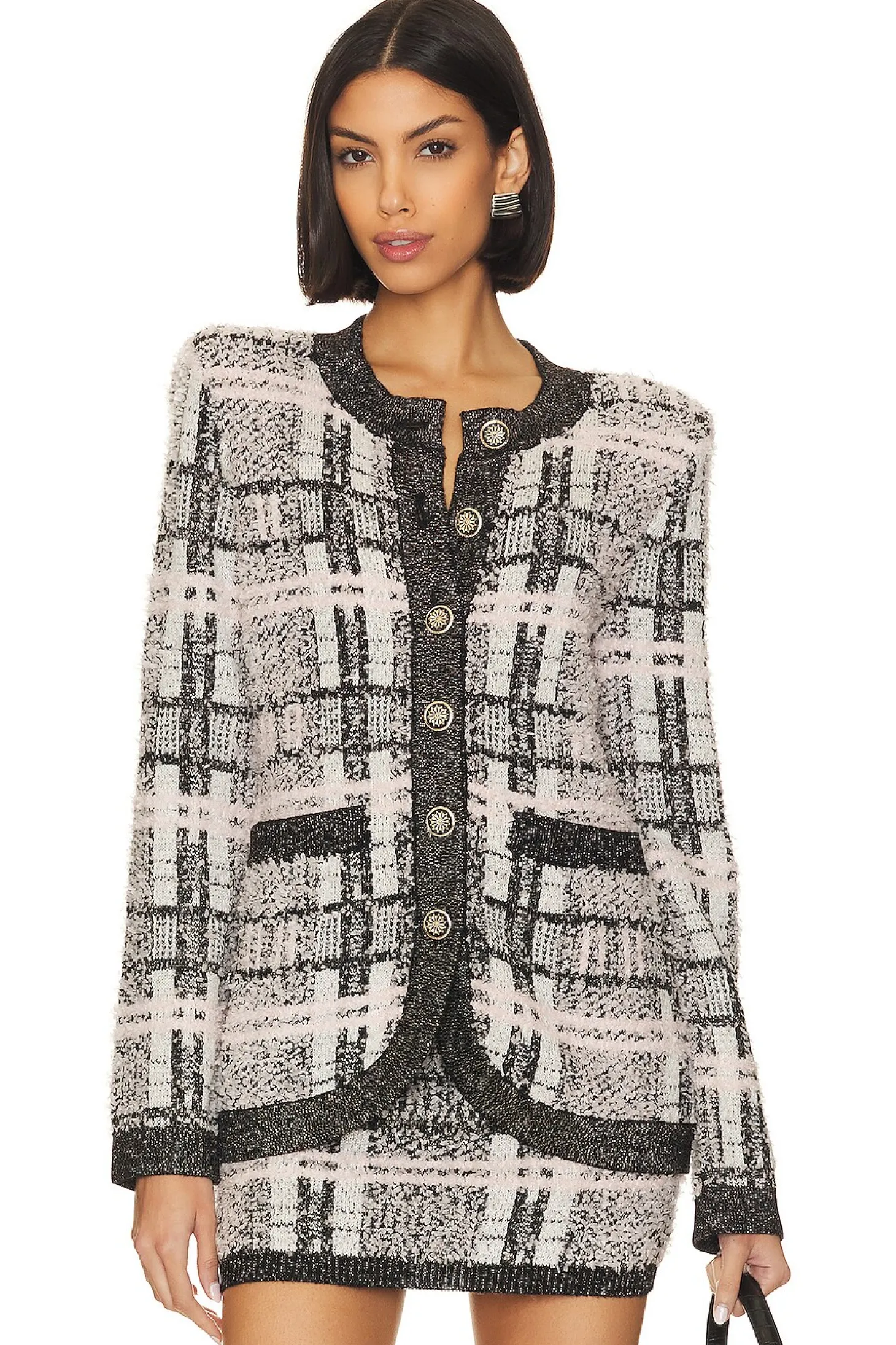 Elevate your style with MAJORELLE's Black Multi Larsa Cardigan. Featuring front button closure, padded shoulders, and front slip pockets in a soft, knit fabric. Complete the set with MAJORELLE's Larsa Skirt (sold separately) for a classic, chic look..56% nylon 27% polyester 10% acrylic 4% lurex 3% wool.Made in China.Hand wash.Front button closure.Padded shoulders.Front slip pockets.Item not sold as a set