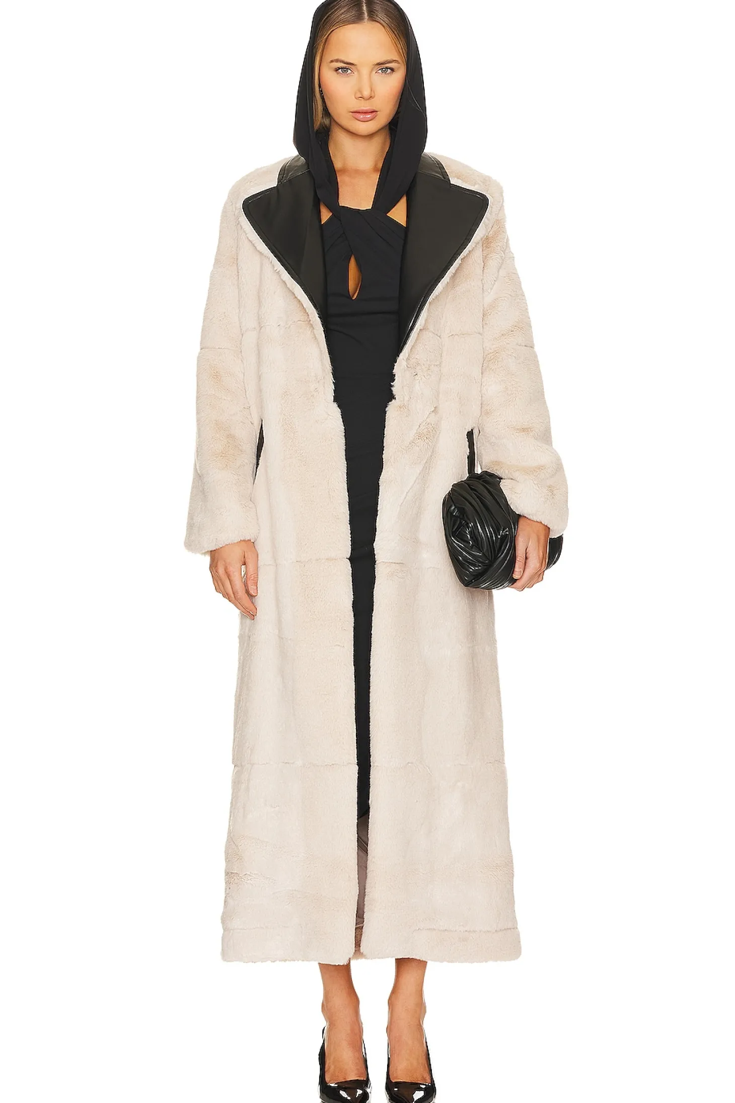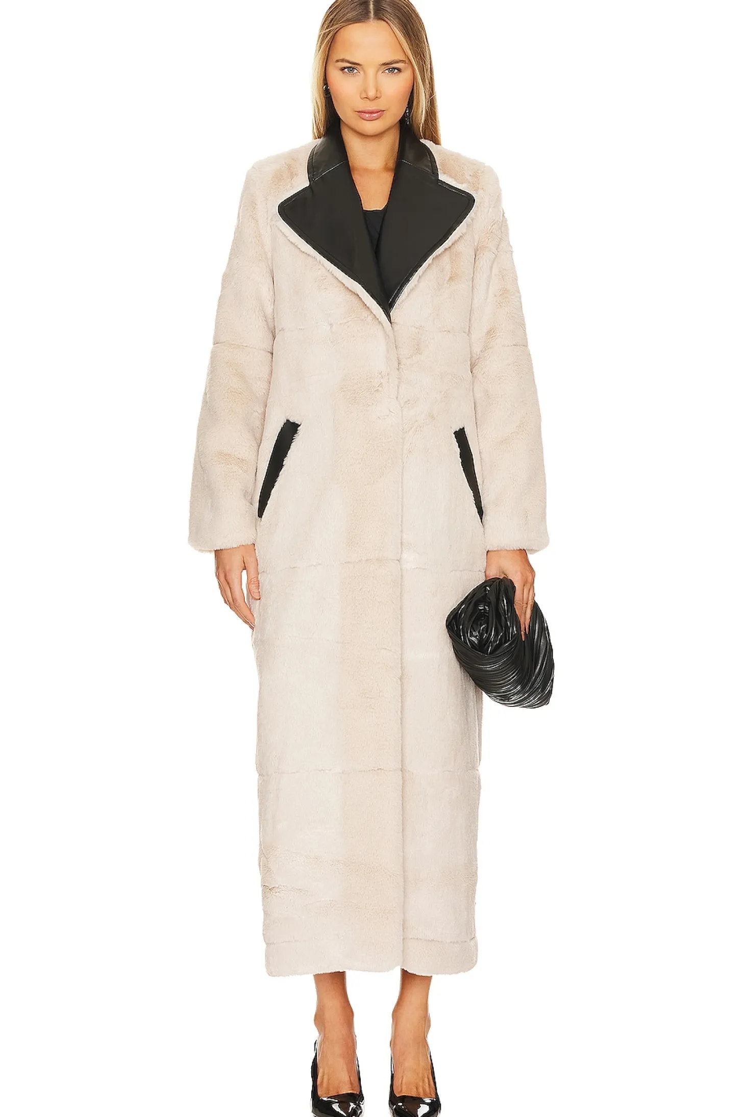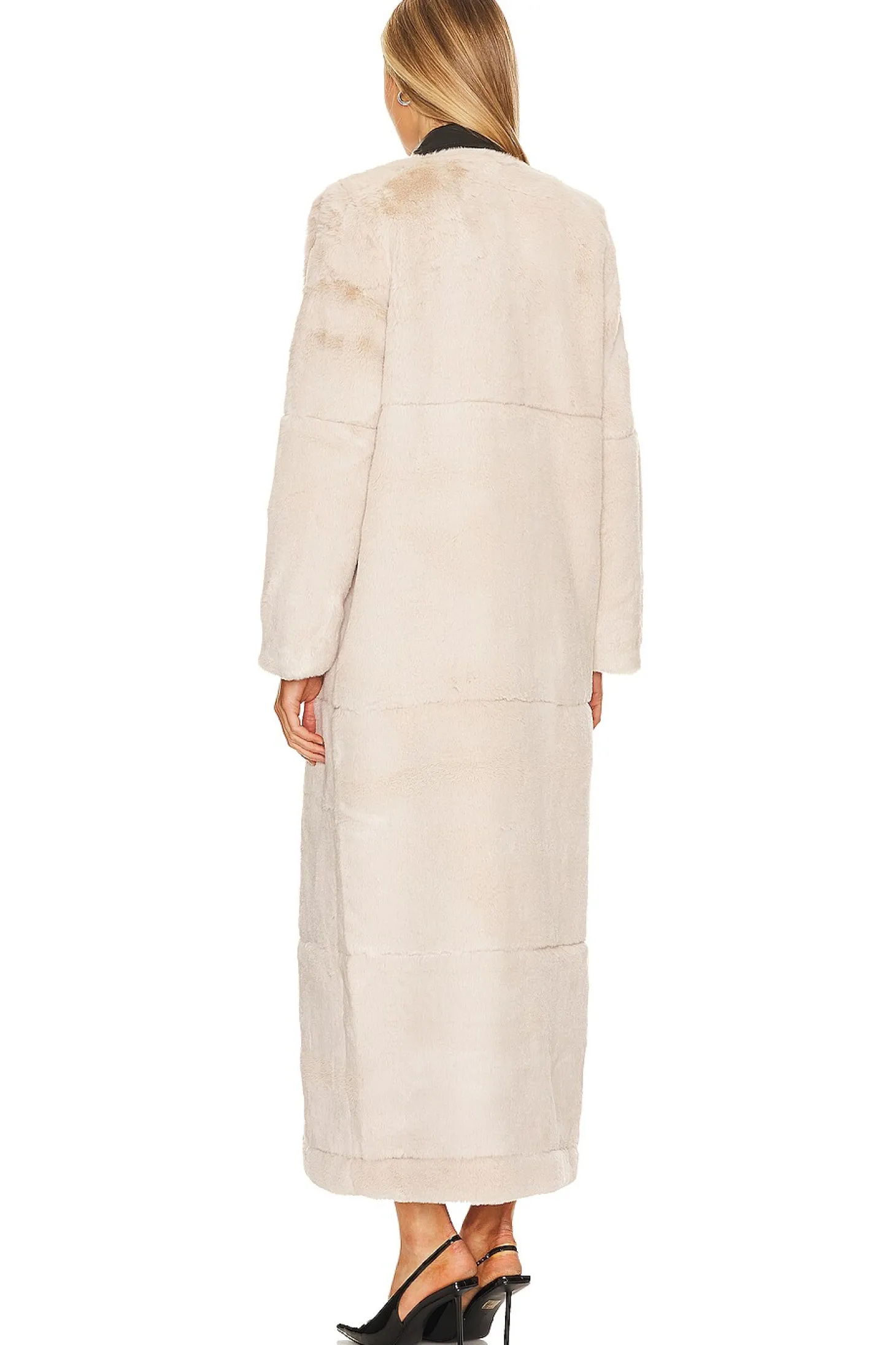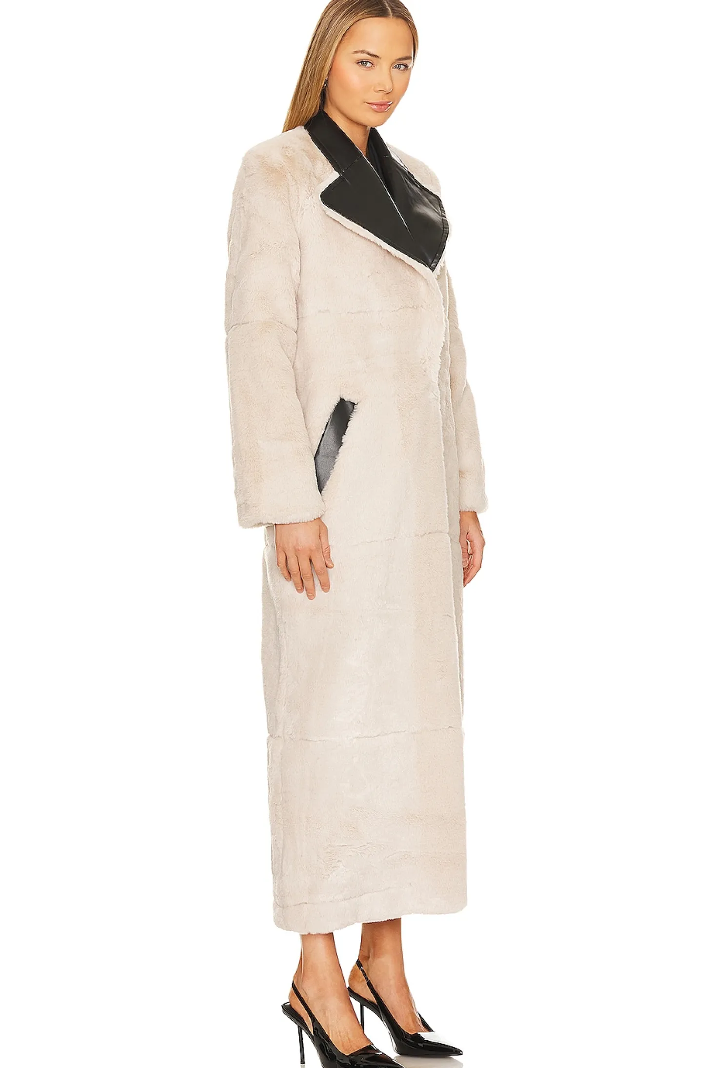Wrap yourself in luxury with NBD's Laurence Faux Fur Coat in Oatmeal. This long, soft faux fur masterpiece is your go-to for chilly winter nights, ensuring you stay warm in style all season long..Self & Lining: 100% polyester Trim: 100% polyurethane.Made in China.Dry clean only.Front snap button closure.Side seam pockets.Midweight faux fur fabric with faux leather trim