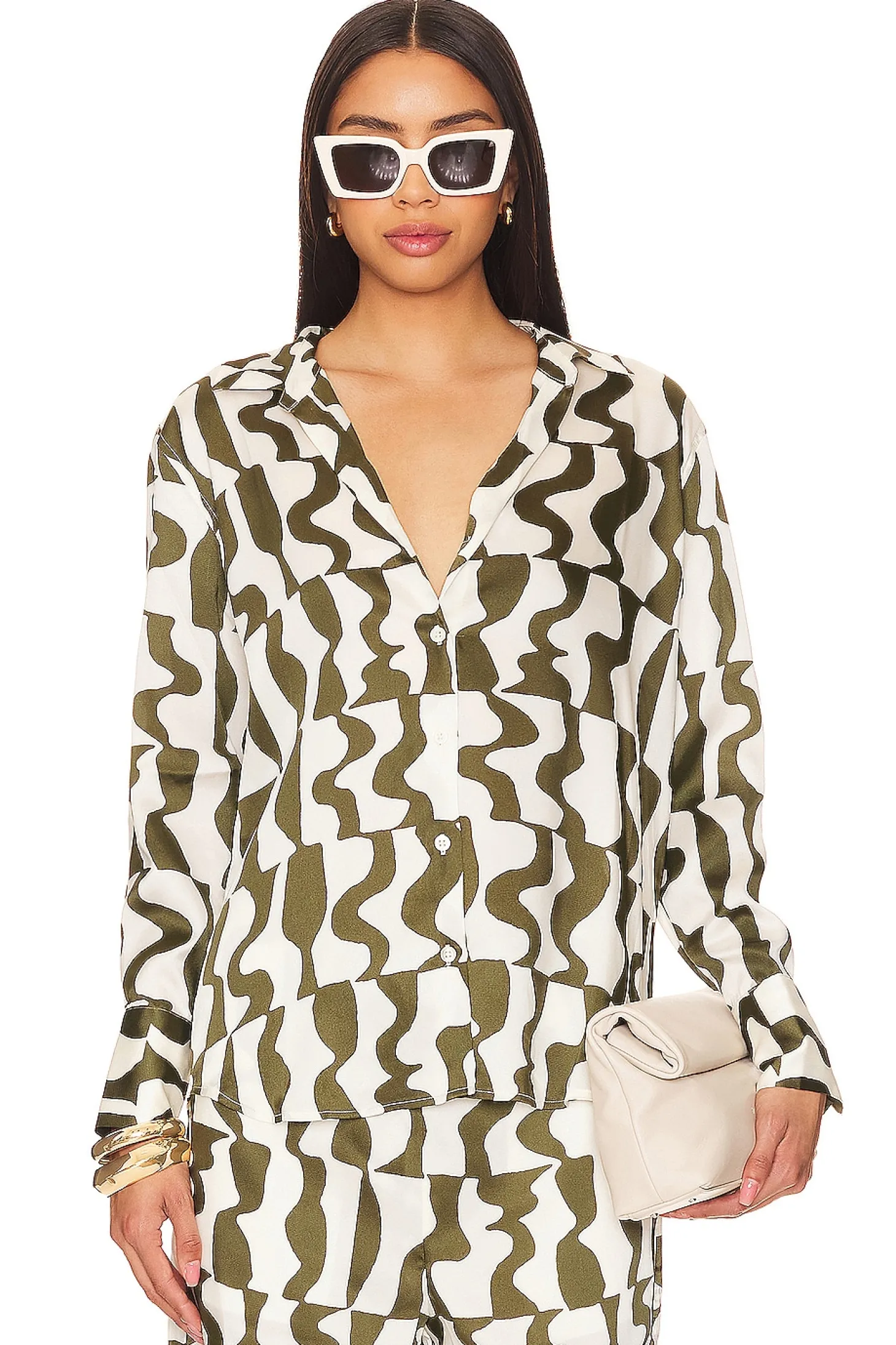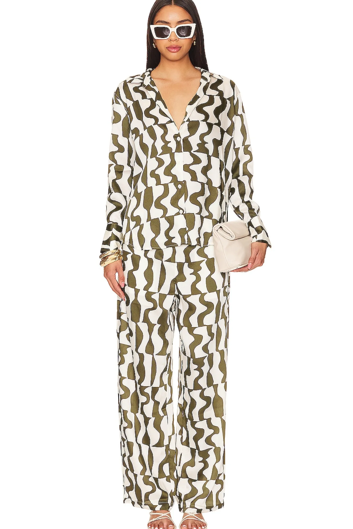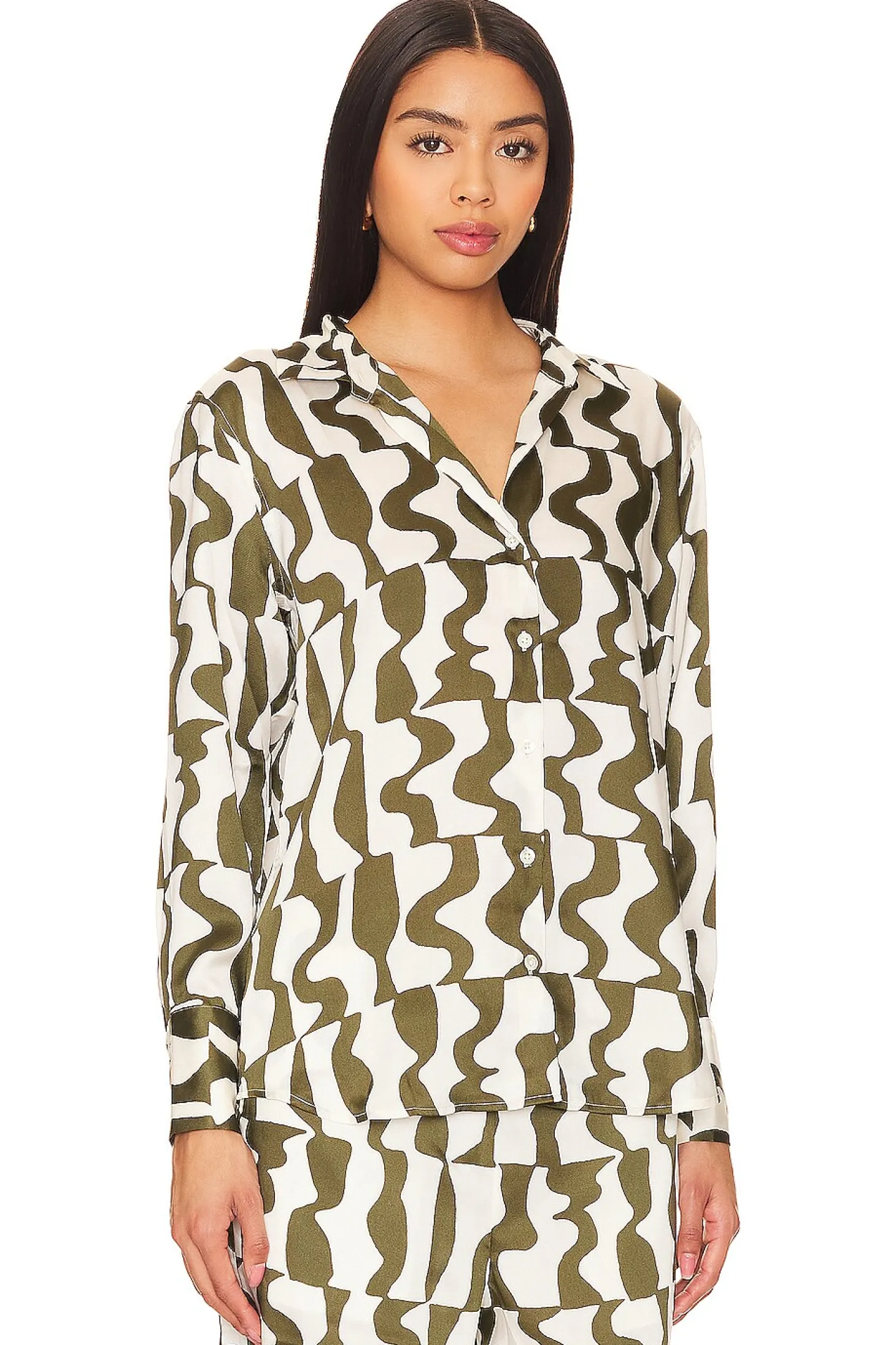 100% polyester.Made in China.Dry clean only.Front button closure.Button cuffs.Satin fabric.Item not sold as set