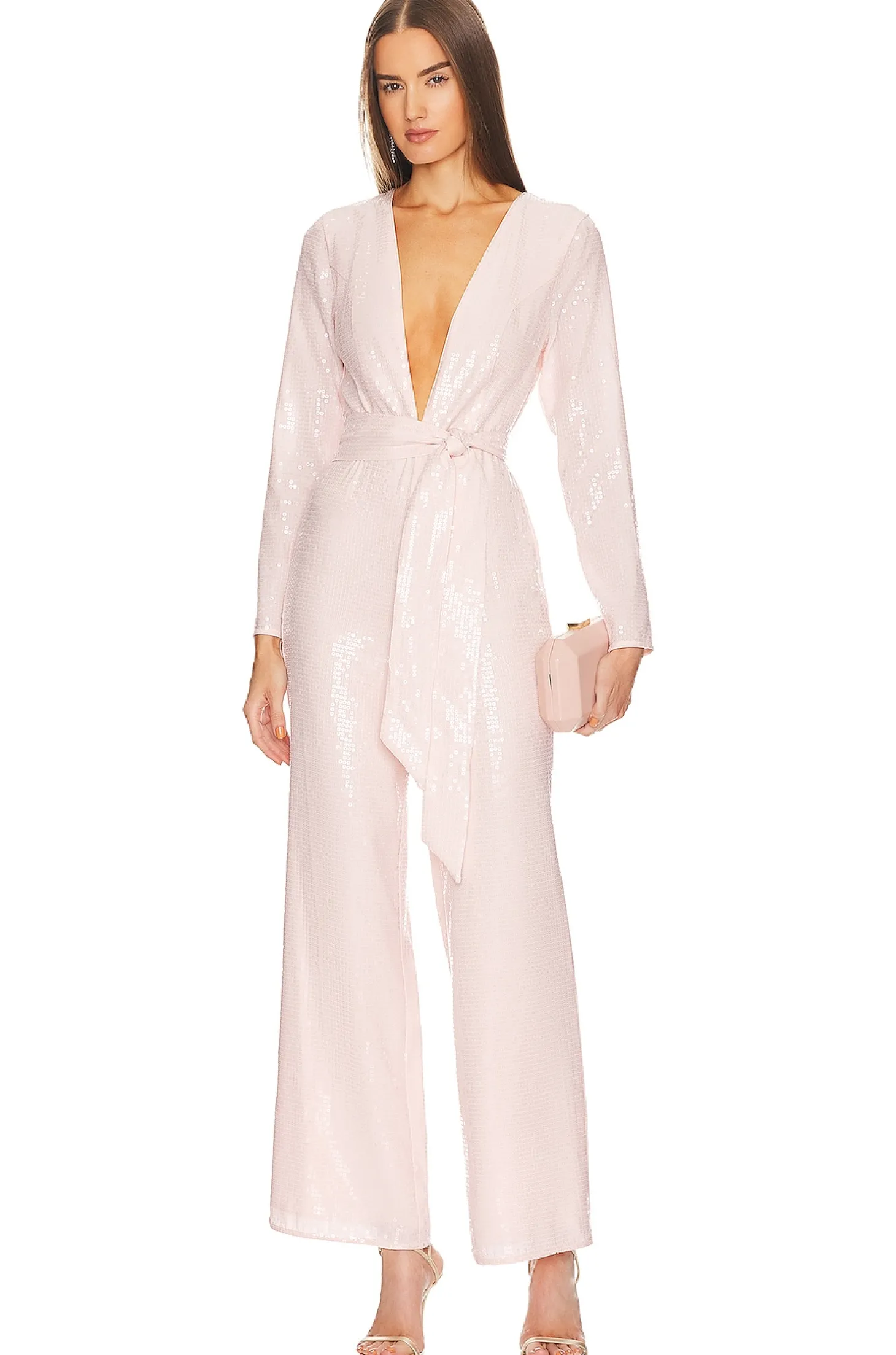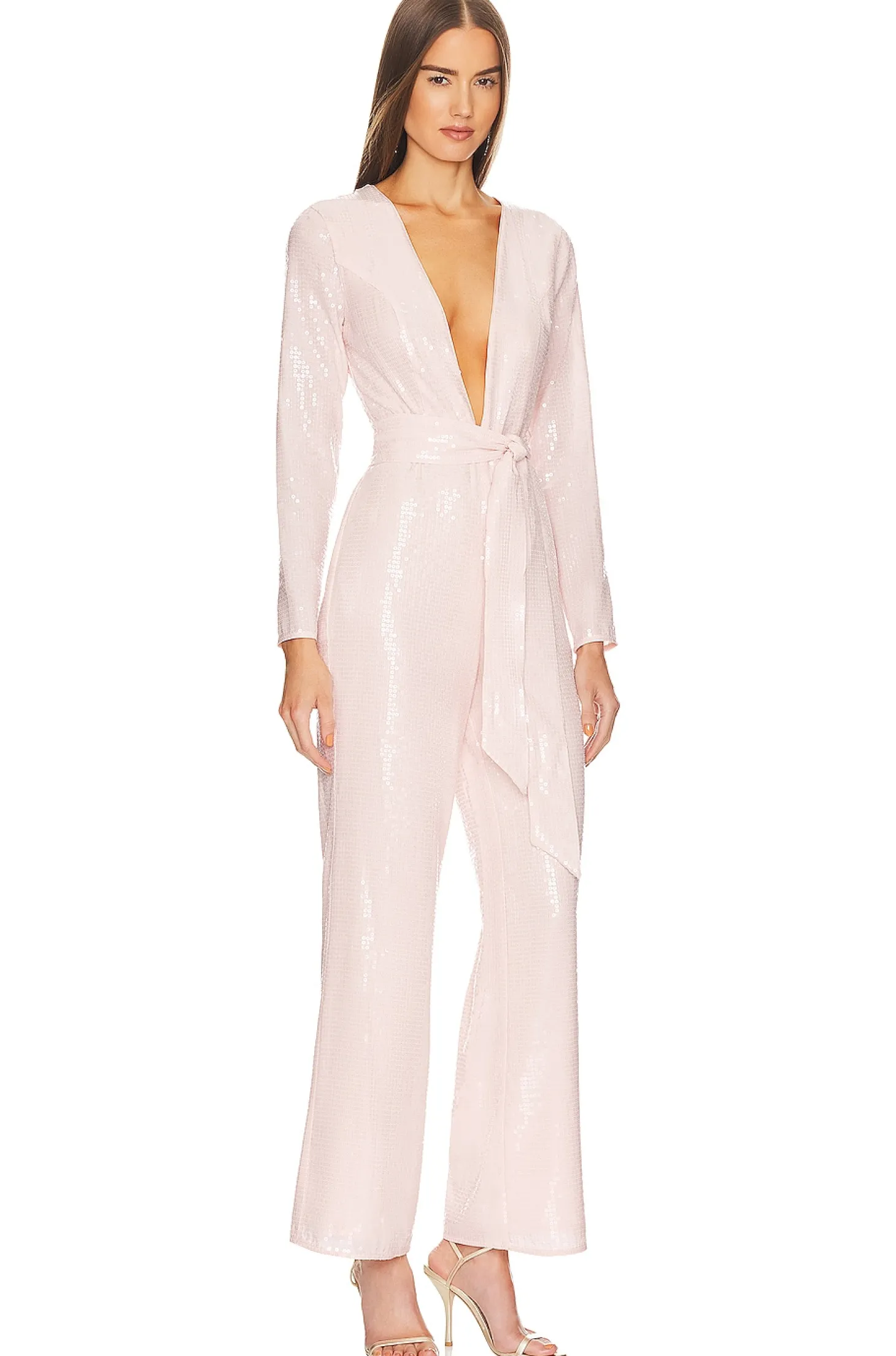 100% polyester.Made in China.Dry clean only.Hidden back zipper closure.Plunging neckline.Detachable waist tie.Sequin embellishments throughout