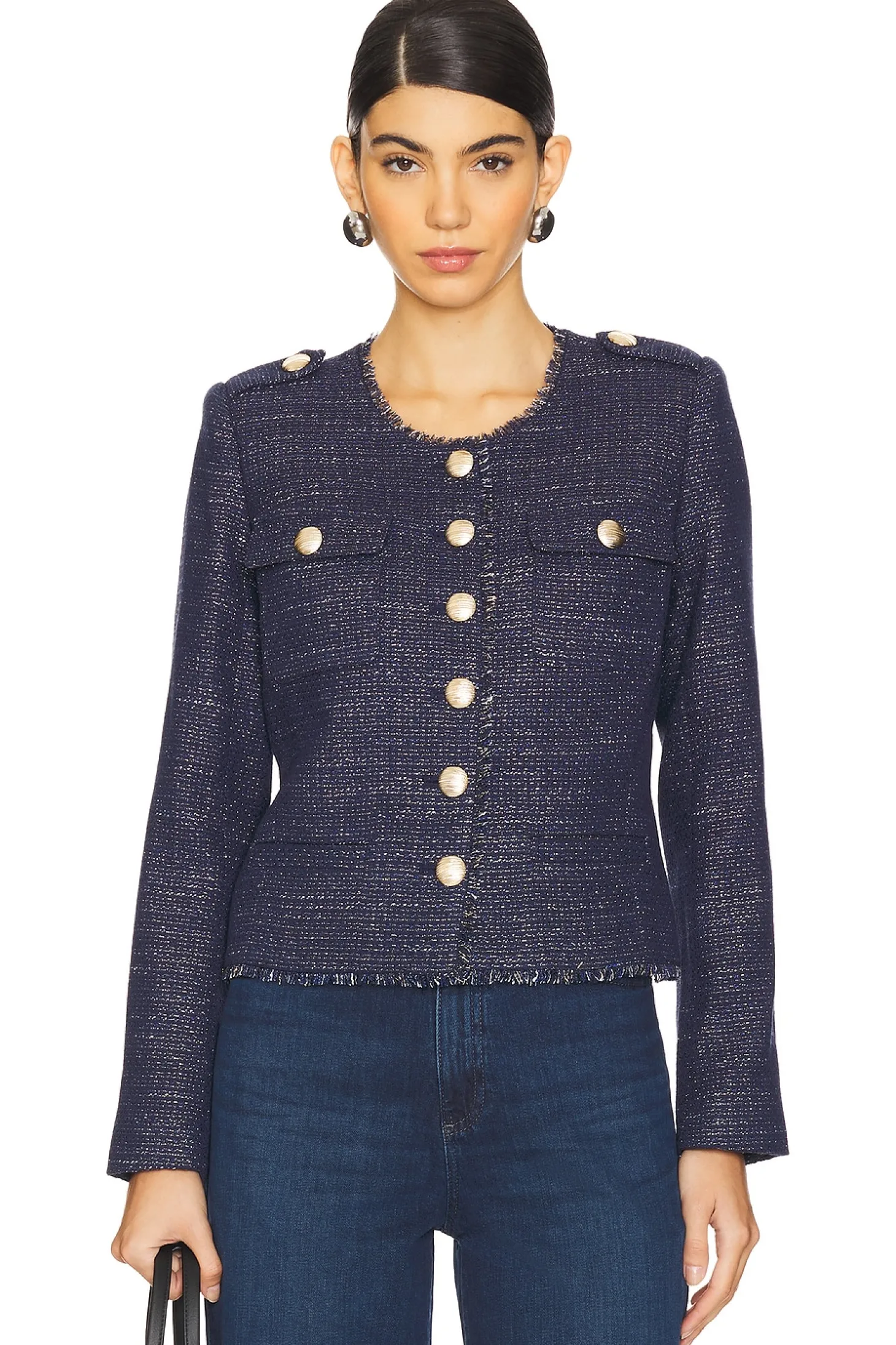 Self: 50% cotton 30% polyester 17% acrylic 2% nylon 1% metallized polyester Lining: 95% polyester 5% elastane.Made in China.Dry clean only.Front gold-tone button closure.Front gold-tone button pockets and button cuffs.Padded shoulders Midweight tweed fabric