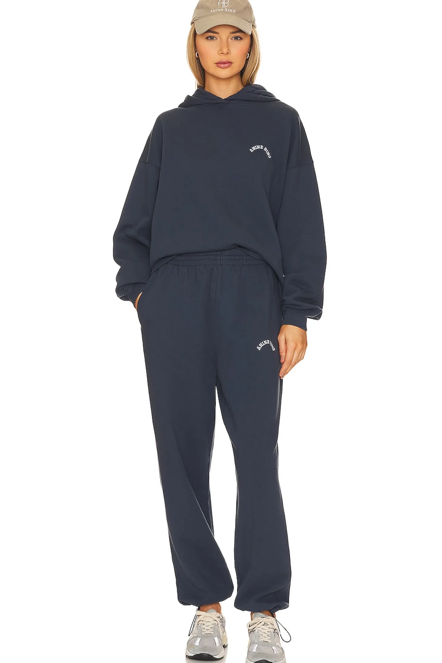 100% cotton.Made in Turkey.Machine wash.Pull-on styling.Side seam pockets.Front Anine Bing logo.Fleece lining Item not sold as a set.20" at the knee narrows to 13" at the leg opening