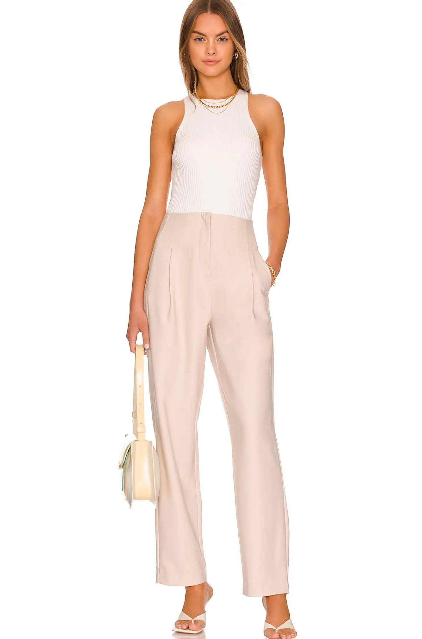 Self: 100% polyester Lining: 100% rayon.Made in China.Dry clean.Zip fly with button closure.Side seam slip pockets.Front pleated detail.17" at the knee narrows to 13" at the leg opening