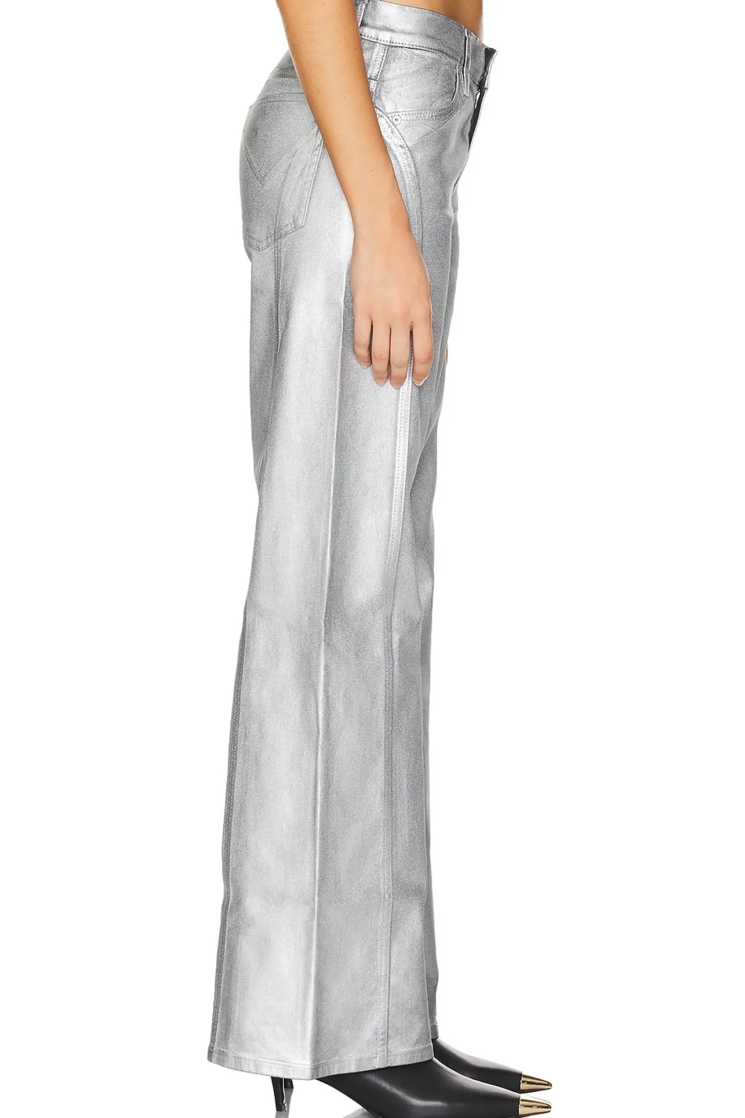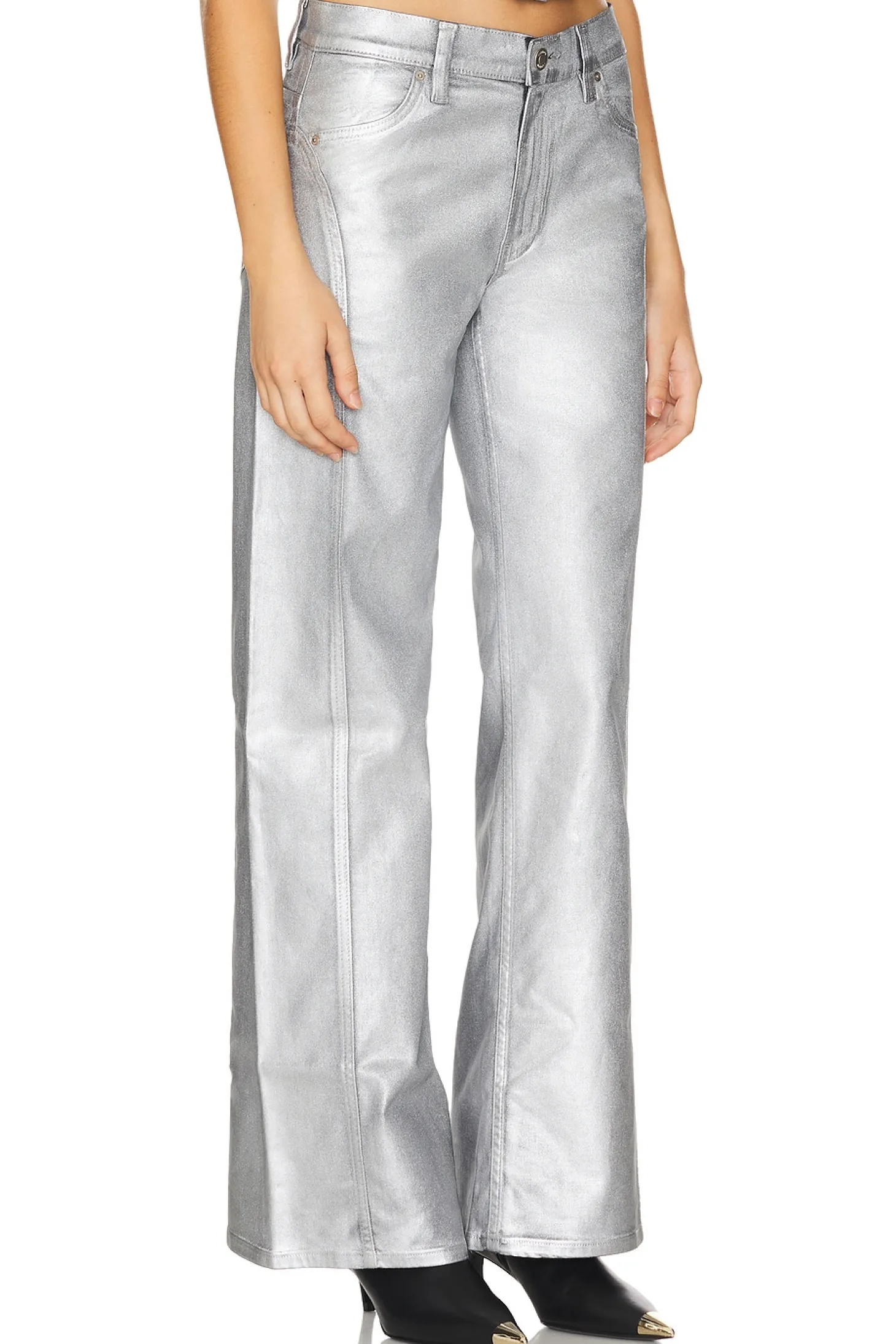 79% cotton 18% modal 3% elastane.Made in China.Dry clean only.Zip fly with button closure.4-pocket styling.Metallic coated denim.Item not sold as a set.21" at the knee and breaks to 23" at the leg opening