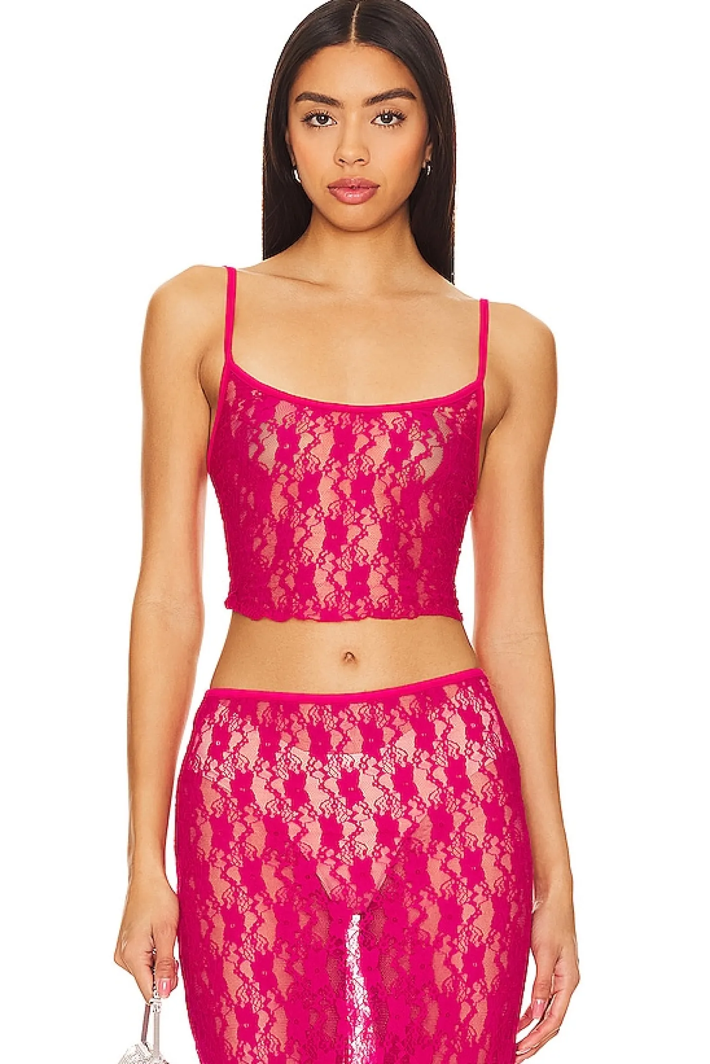 Turn heads and own your 'dressed up naked' look with the Lovers and Friends Lia Sheer Tank Top in Hot Pink. Crafted from delicate lace fabric, this tank is the epitome of sexy meets girly. Unleash your confidence and make a statement like never before!.Self: 92% nylon 8% elastane Contrast Fabric: 95% rayon 5% elastane.Made in China.Hand wash.Lace fabric with adjustable shoulder straps.Garment is intentionally sheer, undergarments will show through..Please note undergarment not included.Item not sold as set