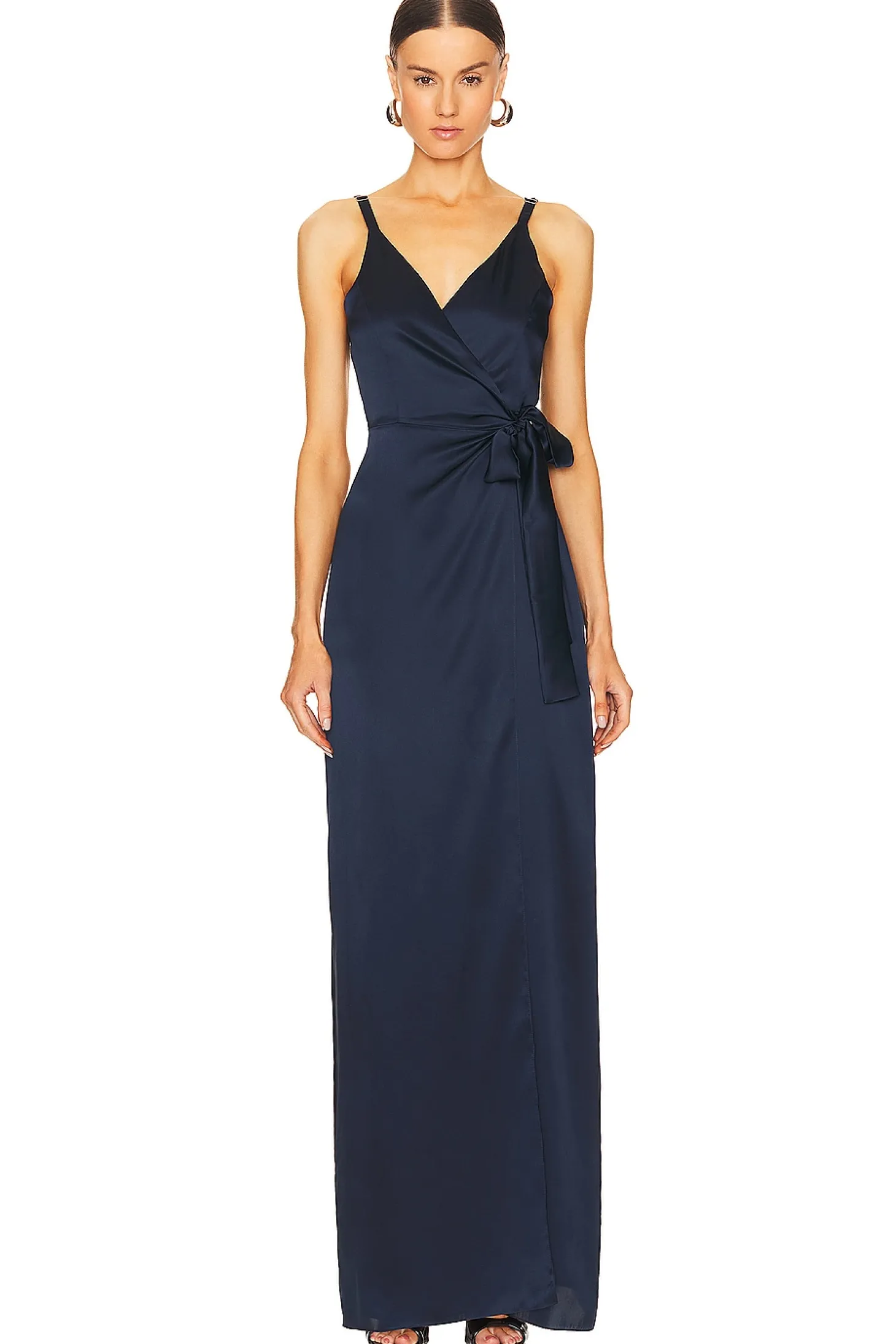 Satin textile.Imported.Dry clean recommended.Partially lined.Wrap styling with tie closure.Adjustable shoulder straps