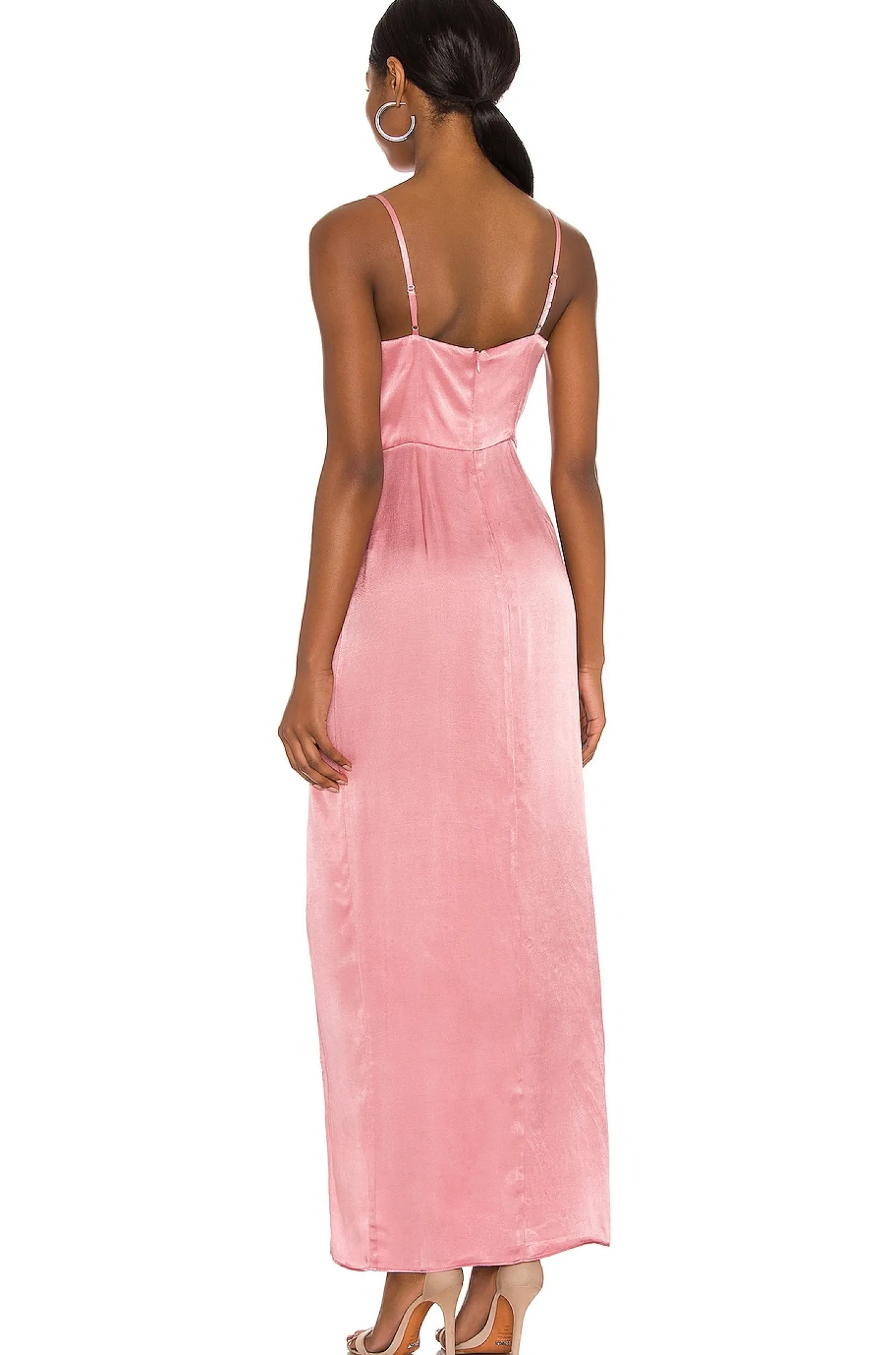 53% viscose 47% rayon.Made in China.Dry clean only.Partially lined satin fabric with sheen finish.Hidden back zipper closure.Adjustable shoulder straps.Cowl neckline and hem slit