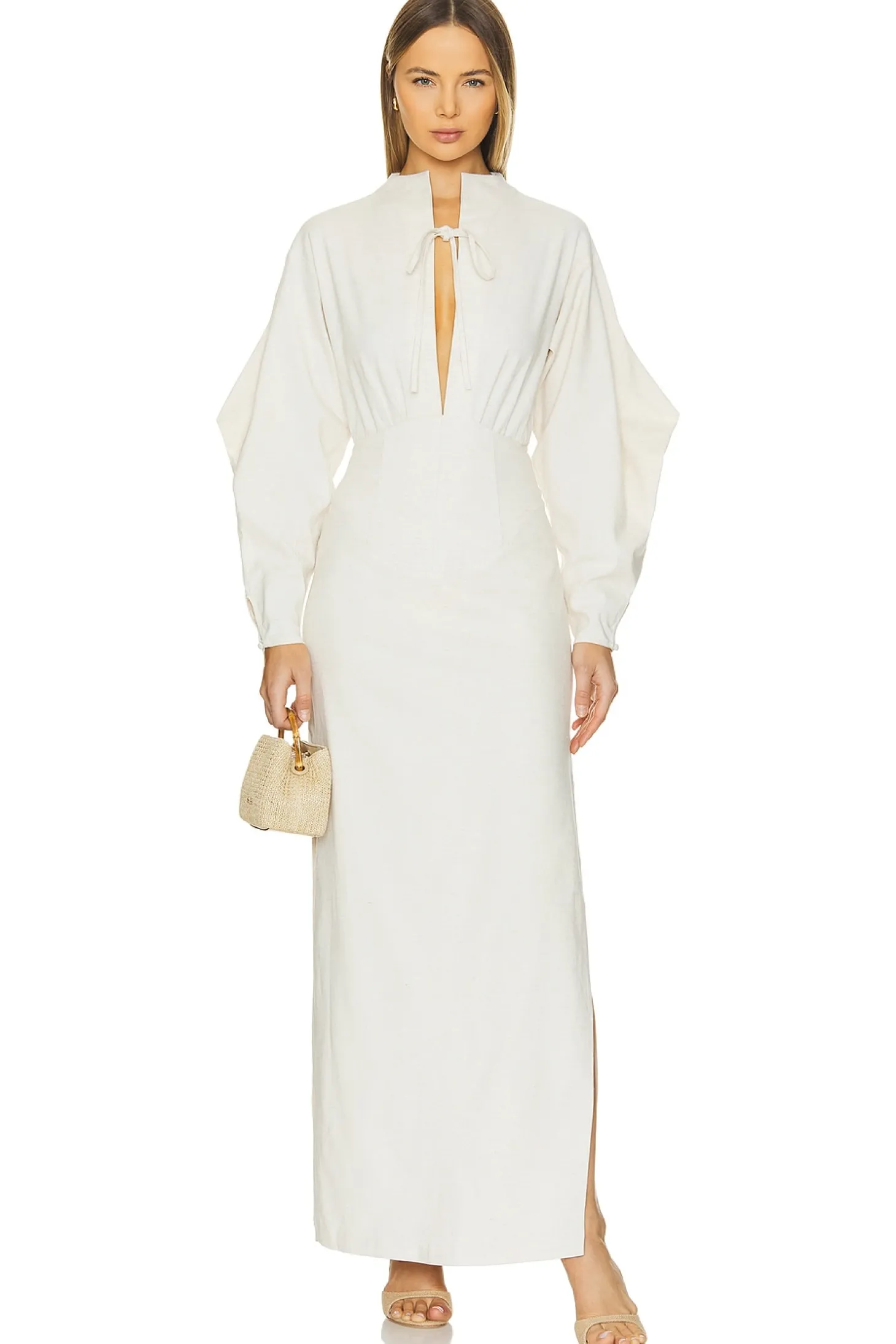 Shell: 67% rayon 30% linen 3% spandex Lining: 100% cotton.Made in China.Hand wash cold.Fully lined.Hidden back zipper closure with back lace-up detail.Skirt measures approx 44.5" in length