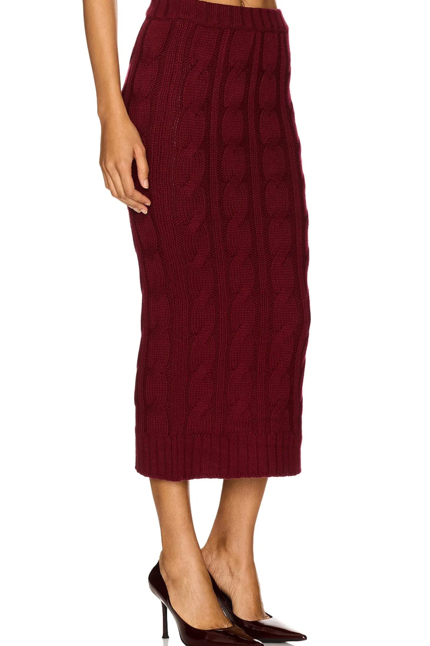 100% virgin wool.Made in Italy.Dry clean only.Unlined.Pull-on styling.elasticized waistband.Heavyweight knit fabric Item not sold as a set.Skirt measures approx 34" in length