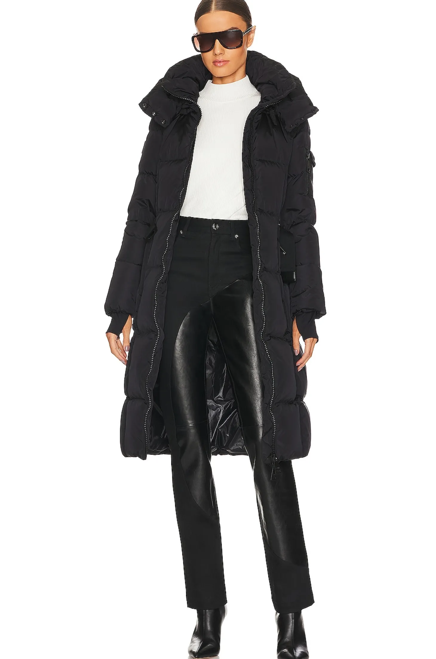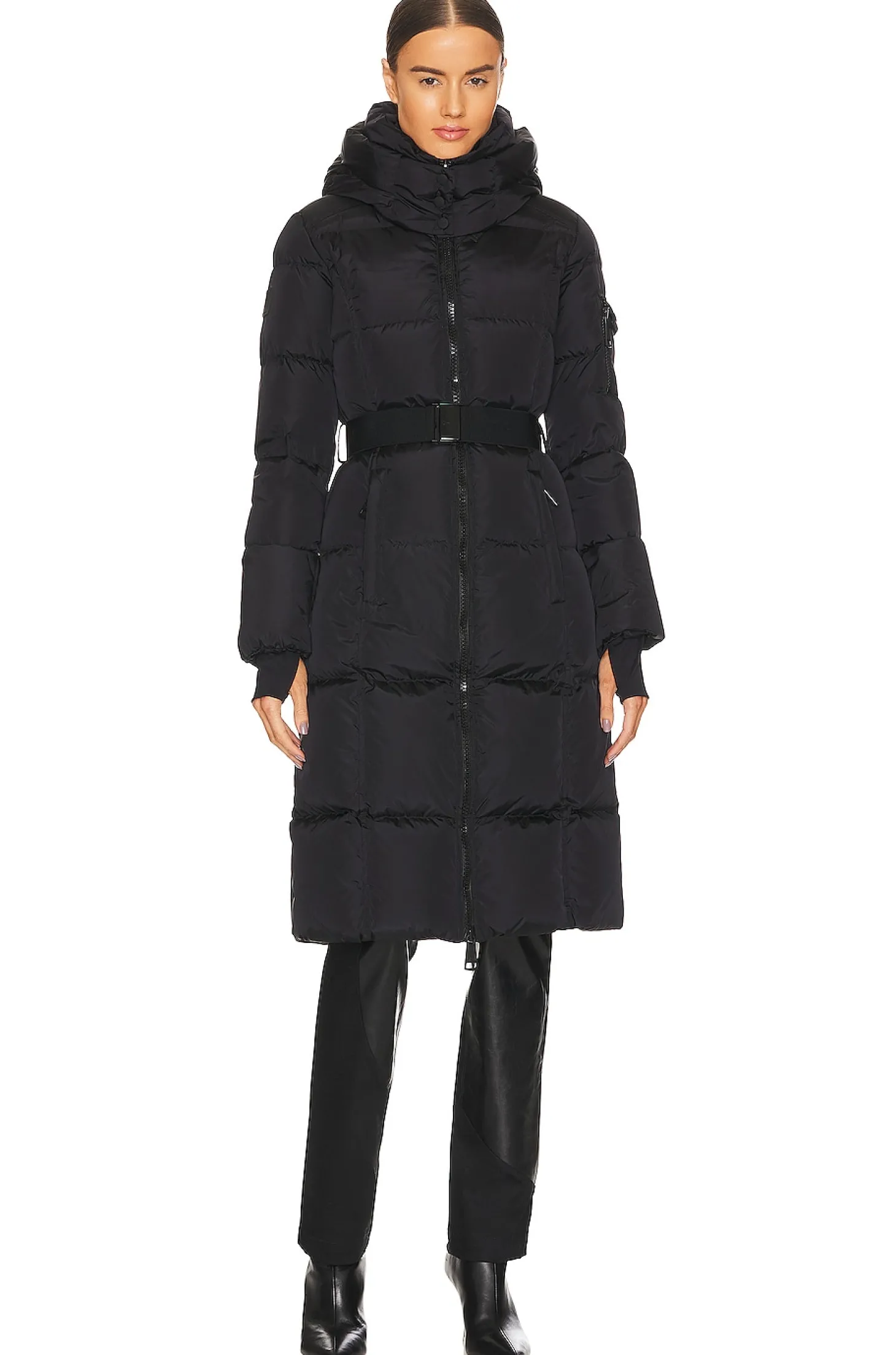 Self: 100% nylon Filling: 90% duck down 10% feathers.Made in China.Dry clean only.Front zipper closure.3-pocket design.Detachable waist belt.Attached hoodie.Heavyweight padded ripstop fabric