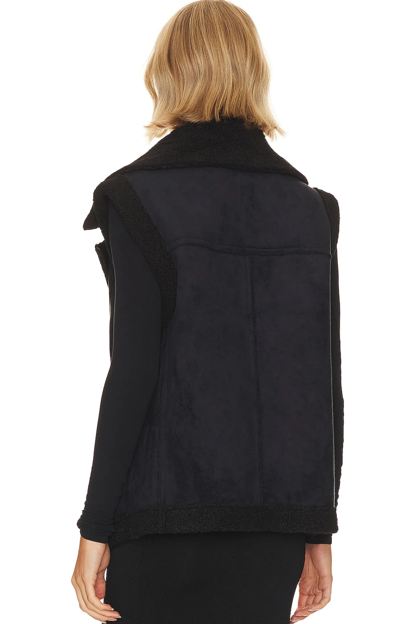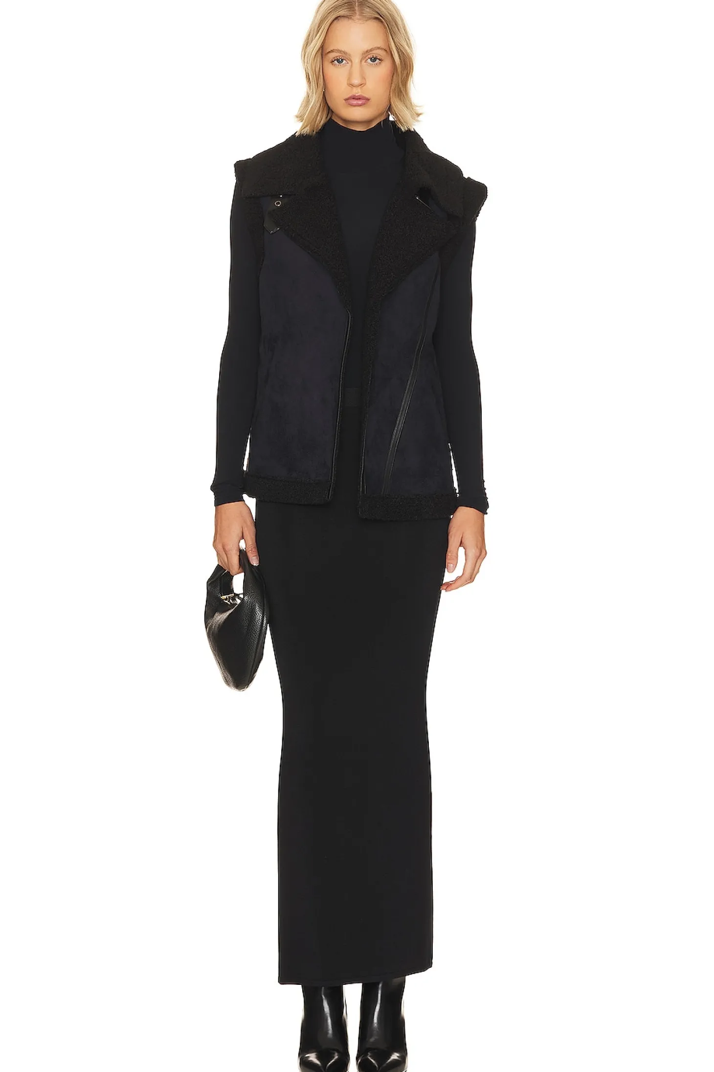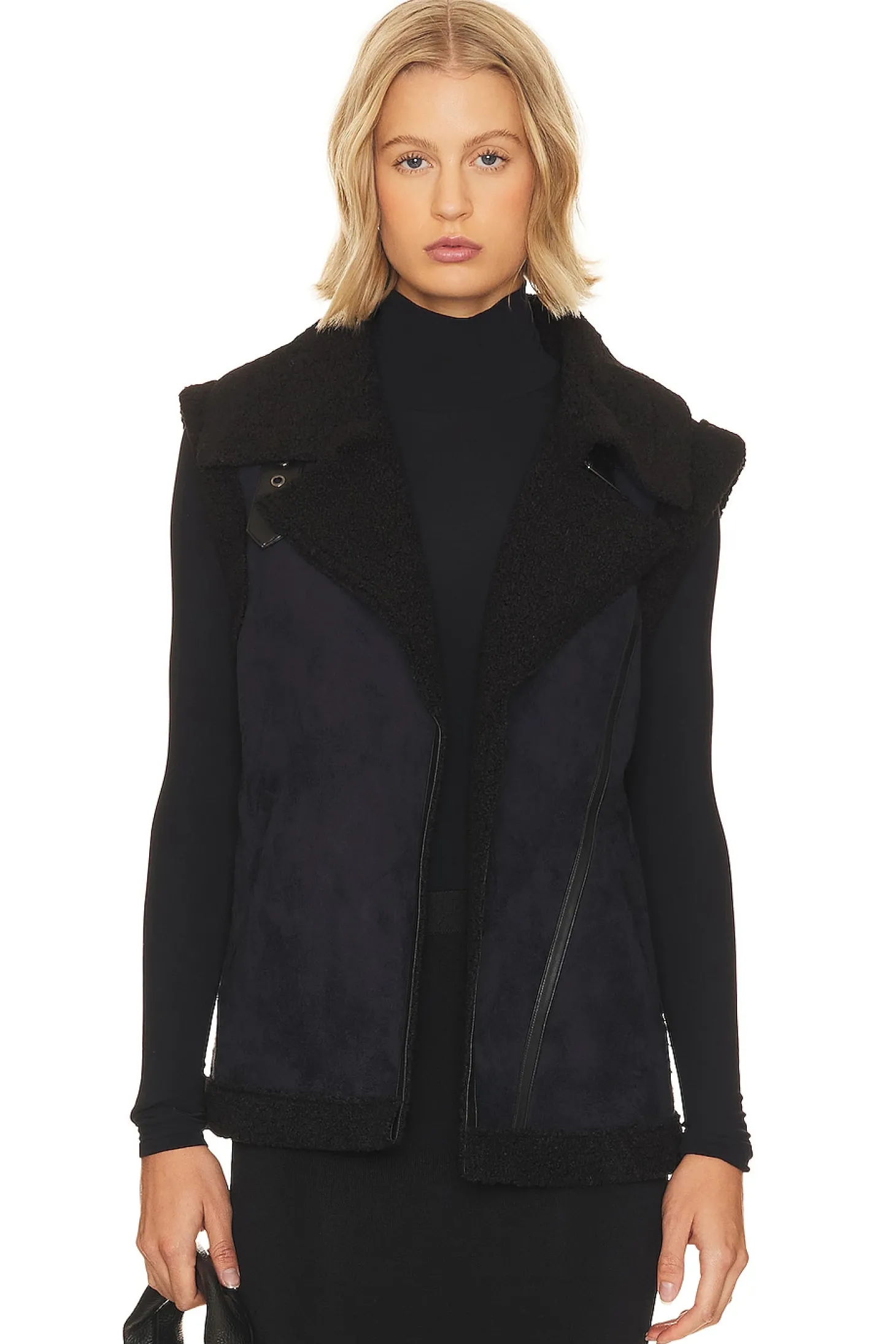 100% polyester.Made in China.Dry clean only.Open front.Side slip pockets.Faux suede and faux fur fabric.Buckle detail at collar